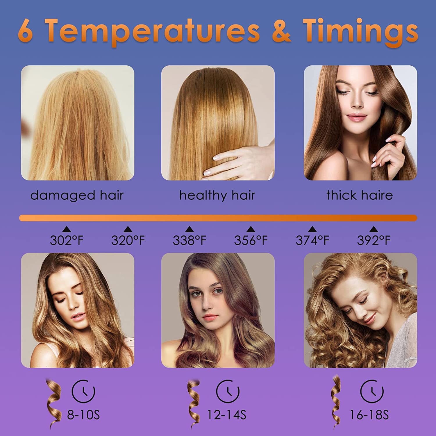 - 2.6 Temperature And 6 Timer Designs:In order to meet the needs of different hair types and hairstyles, our wavy look wireless curler provides adjustable temperature settings from 302 ℉ to 392 ℉. In order to suit different hair types, the 8-18 second timer design can easily select micro curls, medium curls and tight curls