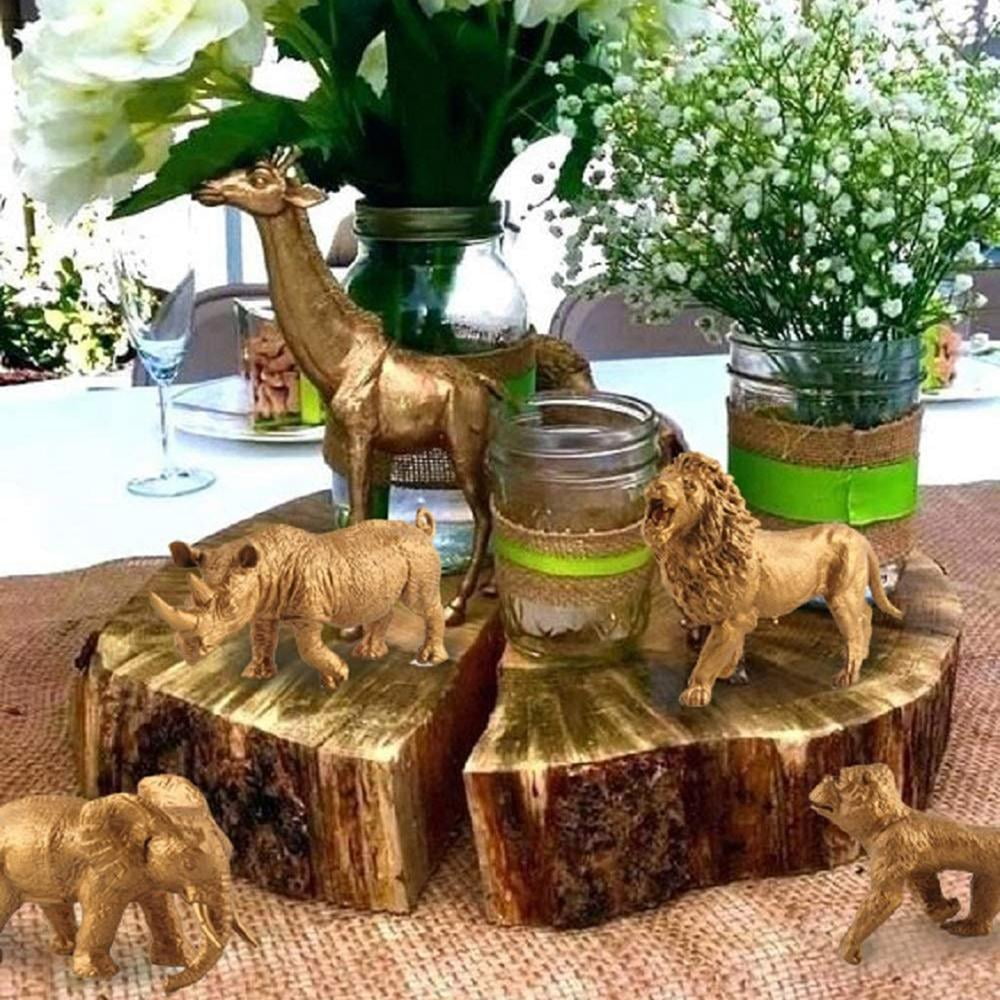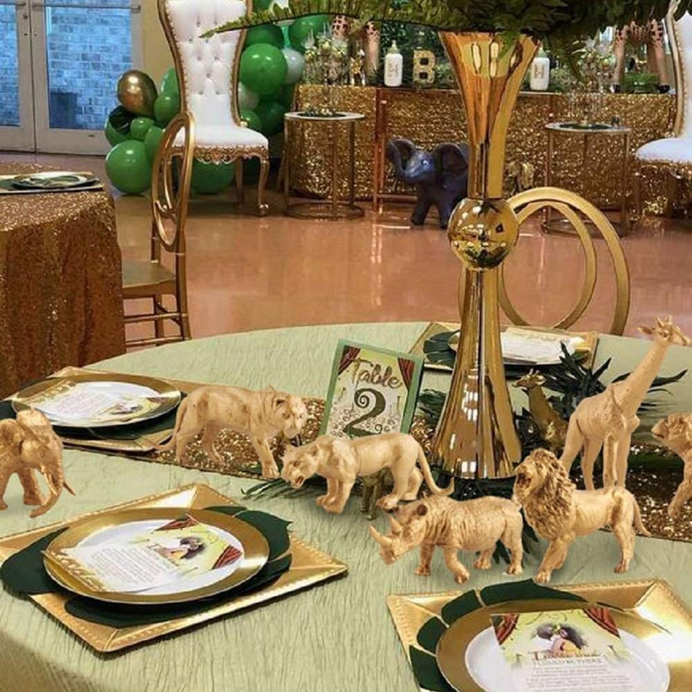 JOLLY 7Pcs Safari Animal Birthday Centerpiece Jungle Gold Wild Animals Figurines Cake Topper and Palm Leaves Set for Jungle Safari Baby Shower Decorations Theme Party Supplies