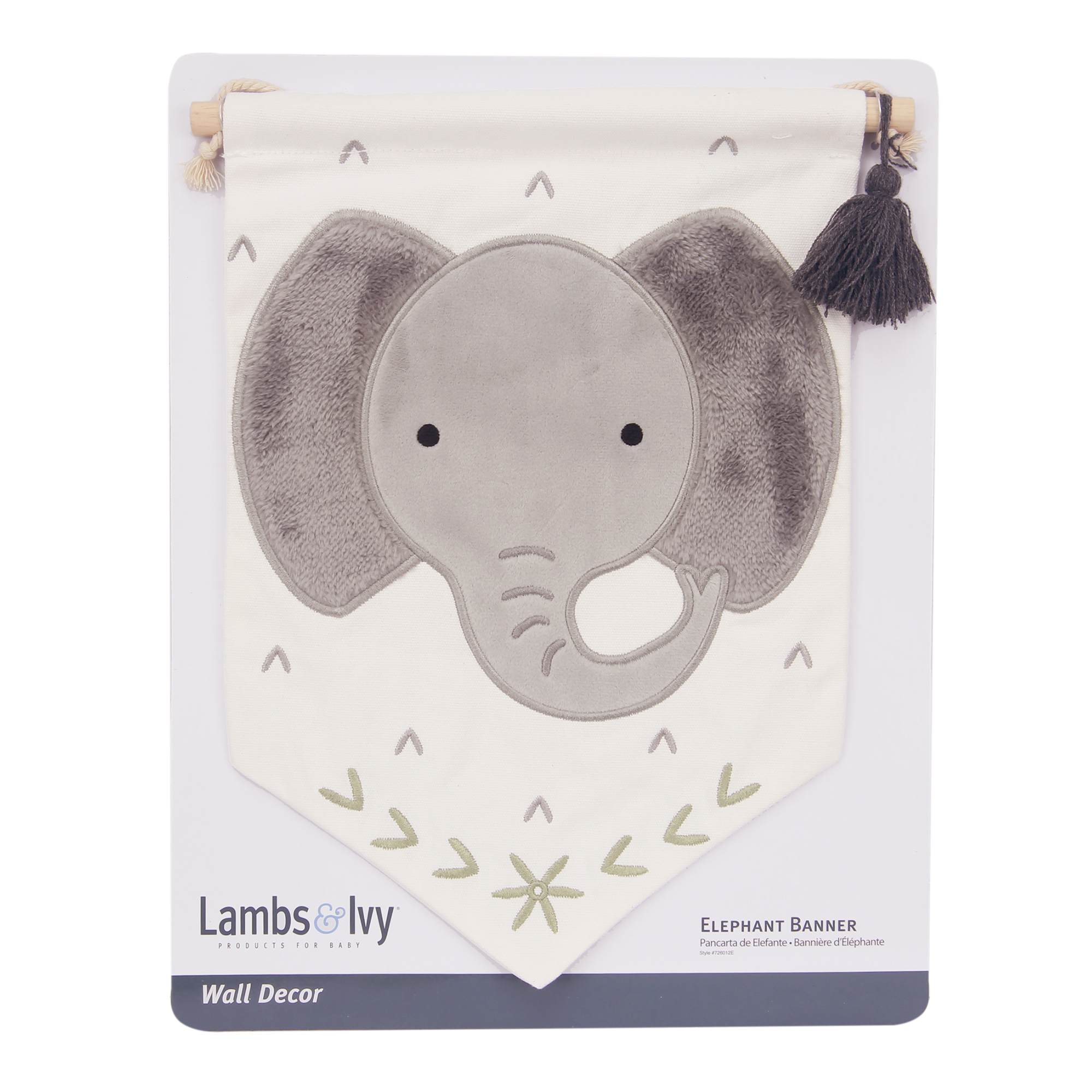 Decorate your child’s room with this charming canvas banner. It is 15” tall and 12” wide excluding the hanging rope. It features an appliqued elephant in a medium gray color on a clean white canvas. The elephant is made in a soft velour fabric. His ears are made in a textured high pile minky. His facial features are embroidered. There is a decorative dark gray 2” tassel, a rubber wooden dowel, and cotton rope. Spot clean only.