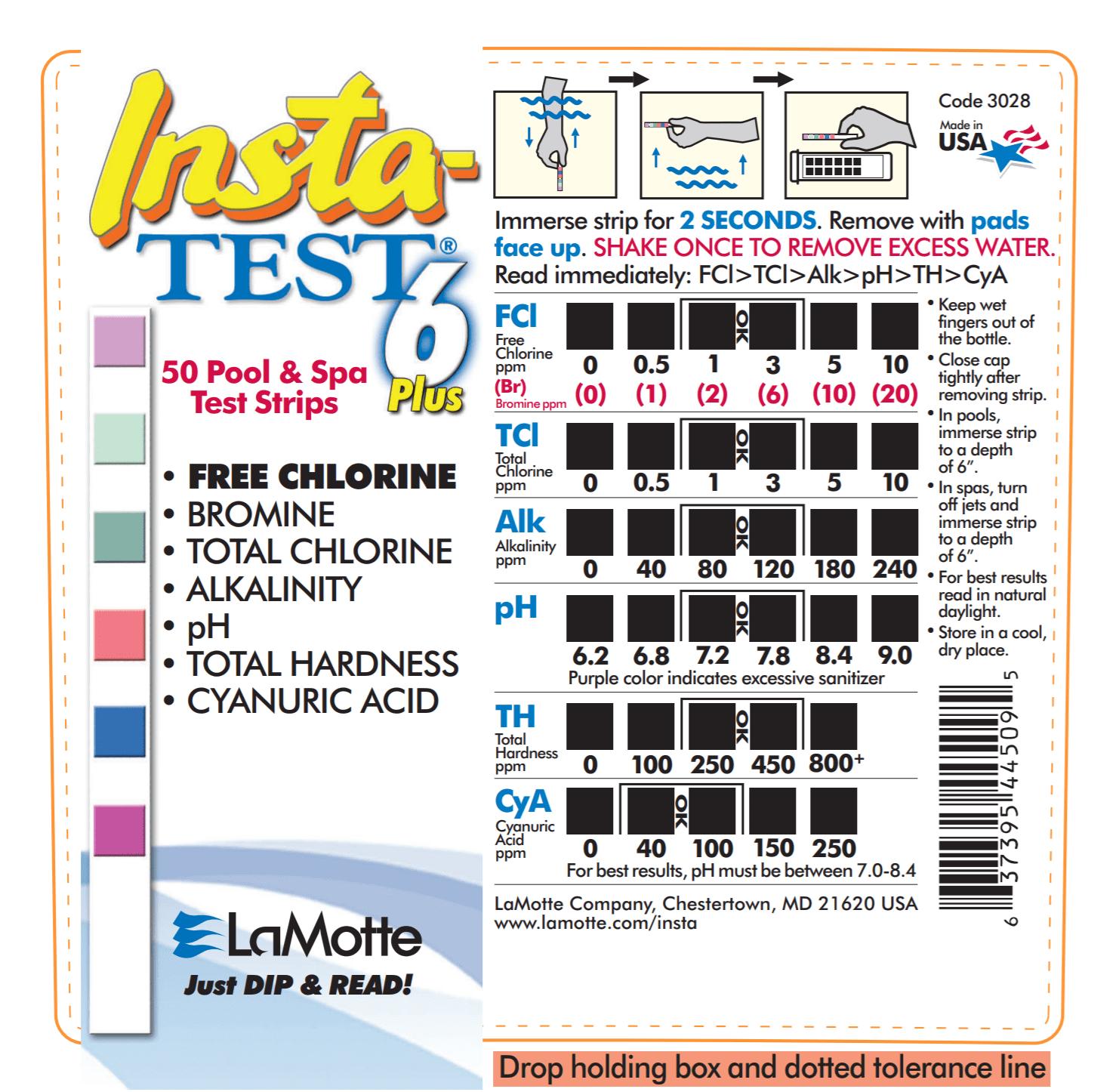Convenient dip and read 6-way strips tests a pool’s freechlorine/bromine, total chlorine, pH, alkalinity, total hardness and cyanuric acid levels. Fifty strips per bottle.