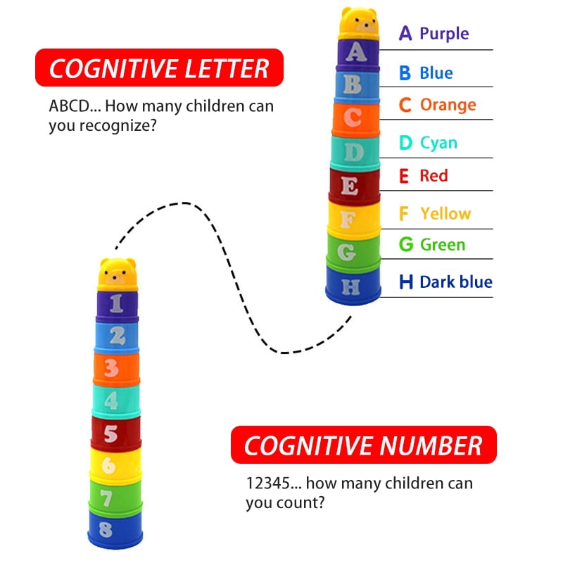 - Learning Skills – Your baby can stack and nest cups, identify colors, differentiate sizes, match shapes and study numbers! Playing develops kids’ fine-motor skills, hand-eye coordination, and problem-solving skills.
