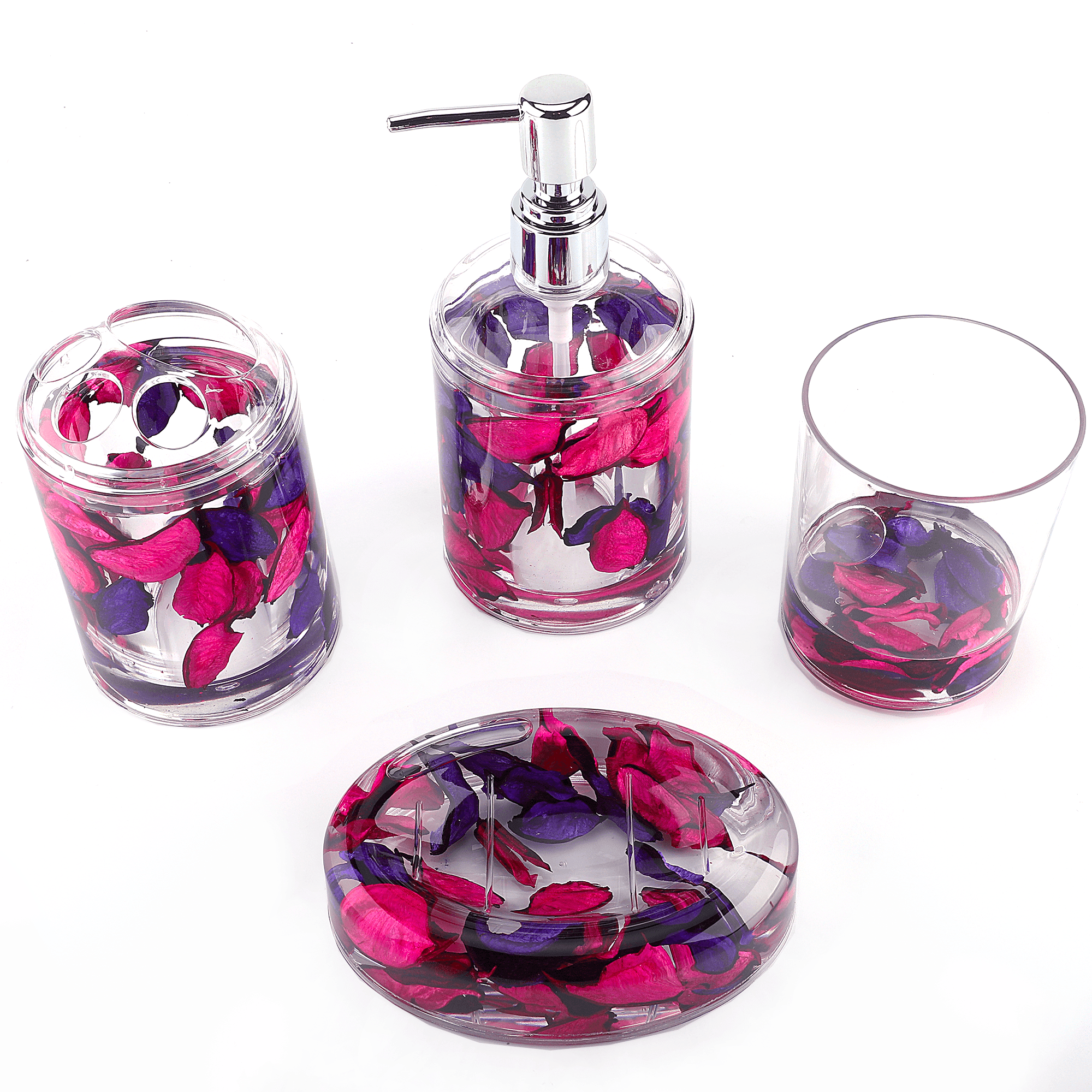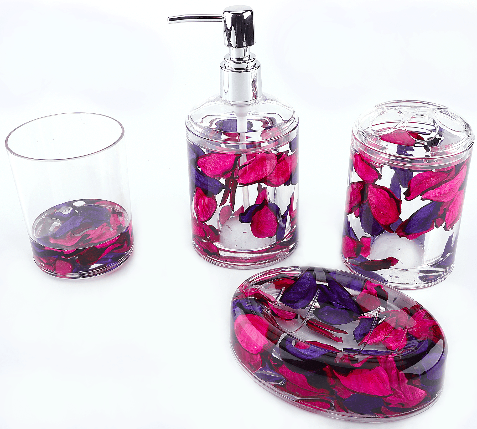 It is time to replace your Vanity Accessory with Locco Decor acrylic floating set. Our bathroom set offers a dynamic change to your bathroom and turns stationary objects into entertaining art pieces with floating motion. All of our fill-ins are hand-crafted with all-natural materials. The shells are hand-cleaned, fishes are hand-painted, and flowers are air-dried. Our workers put their maximum effort into creating your perfect decorations, bringing a clean, organized and elegant looking to your sweet home. All the items are designed for multi-functions. Use the tumbler as a cocktail cup, toothbrush holder as a penholder, and Soap Holder as a paper clip holder. All items are firmly sealed and free of heavy metal elements. Let the small objects brighten every morning in your life!