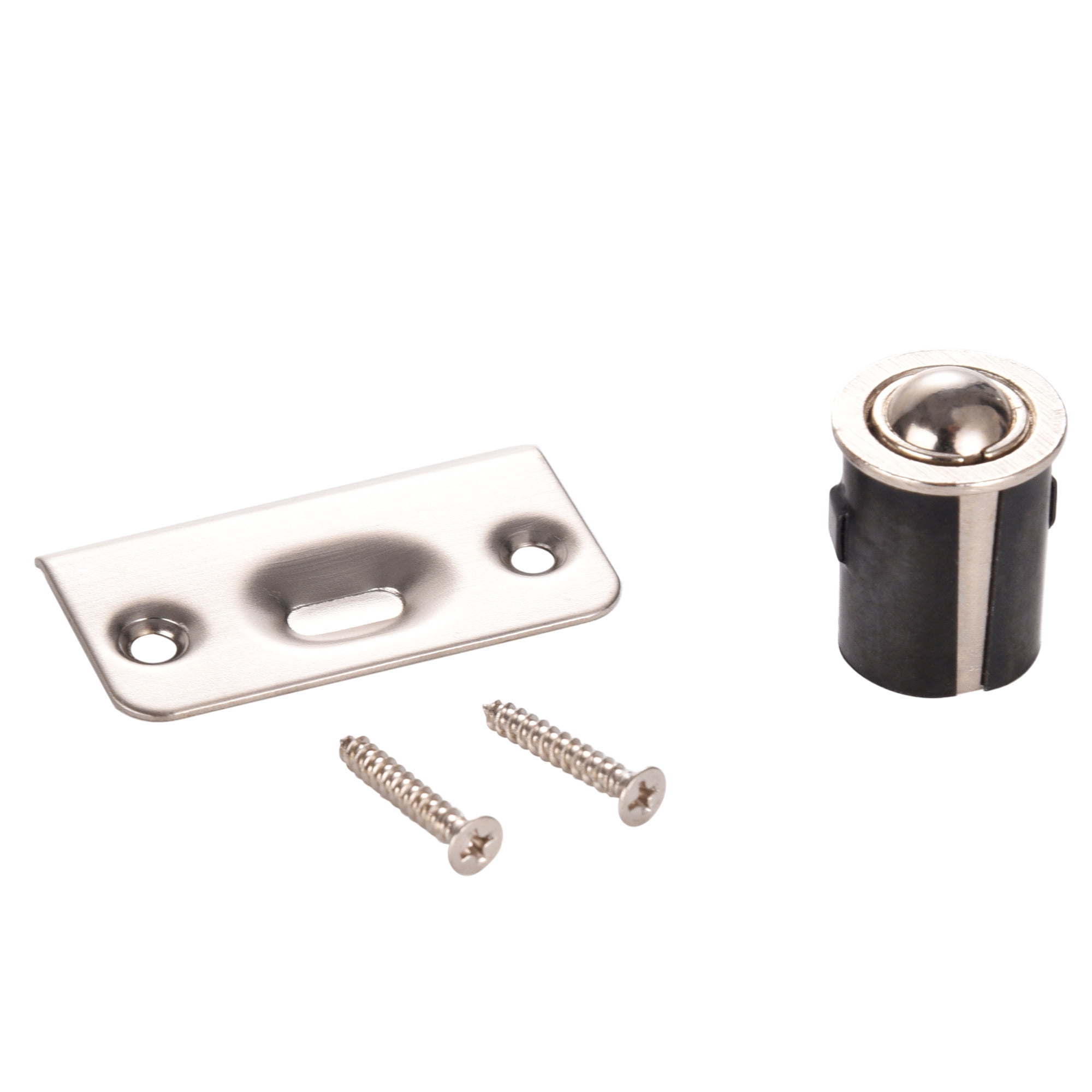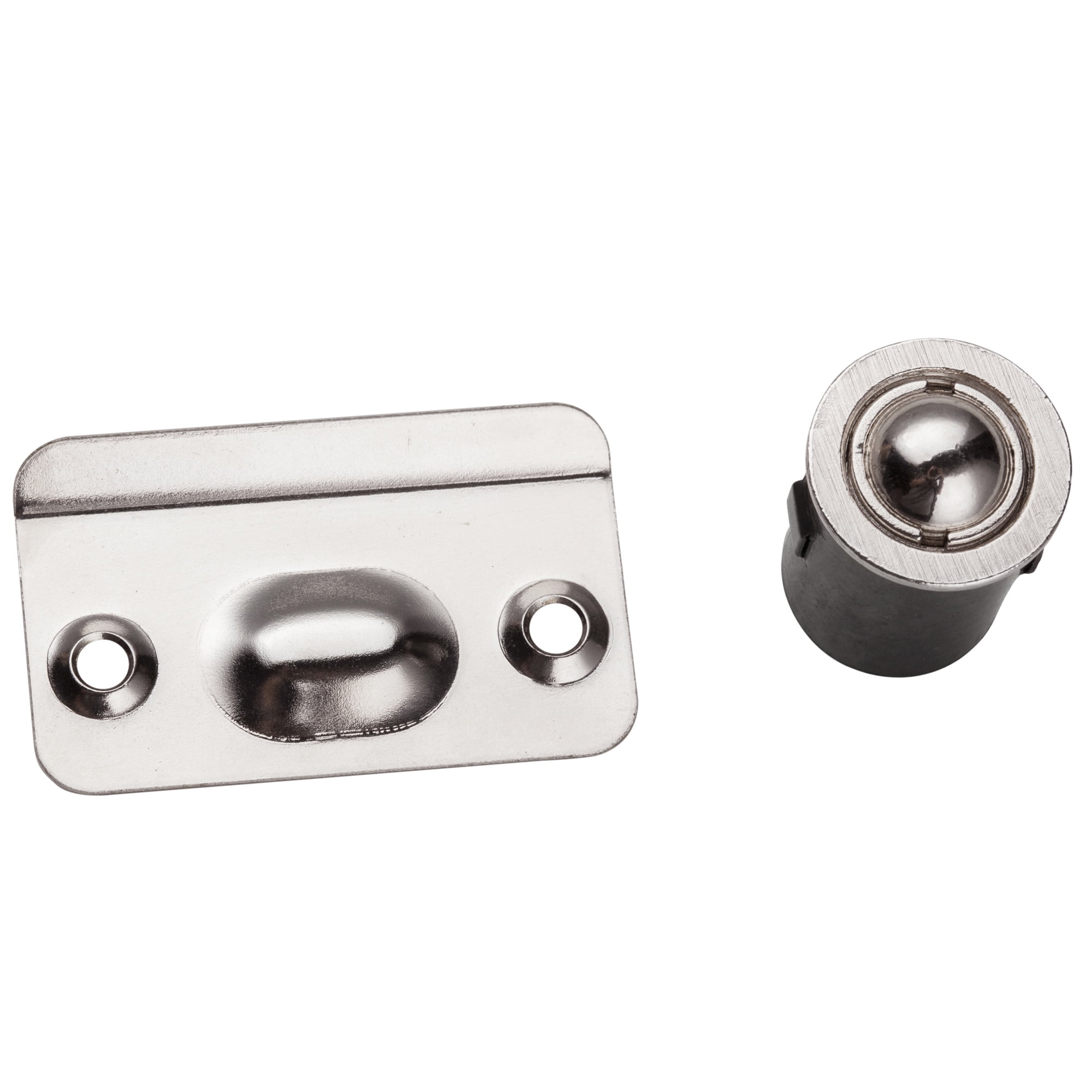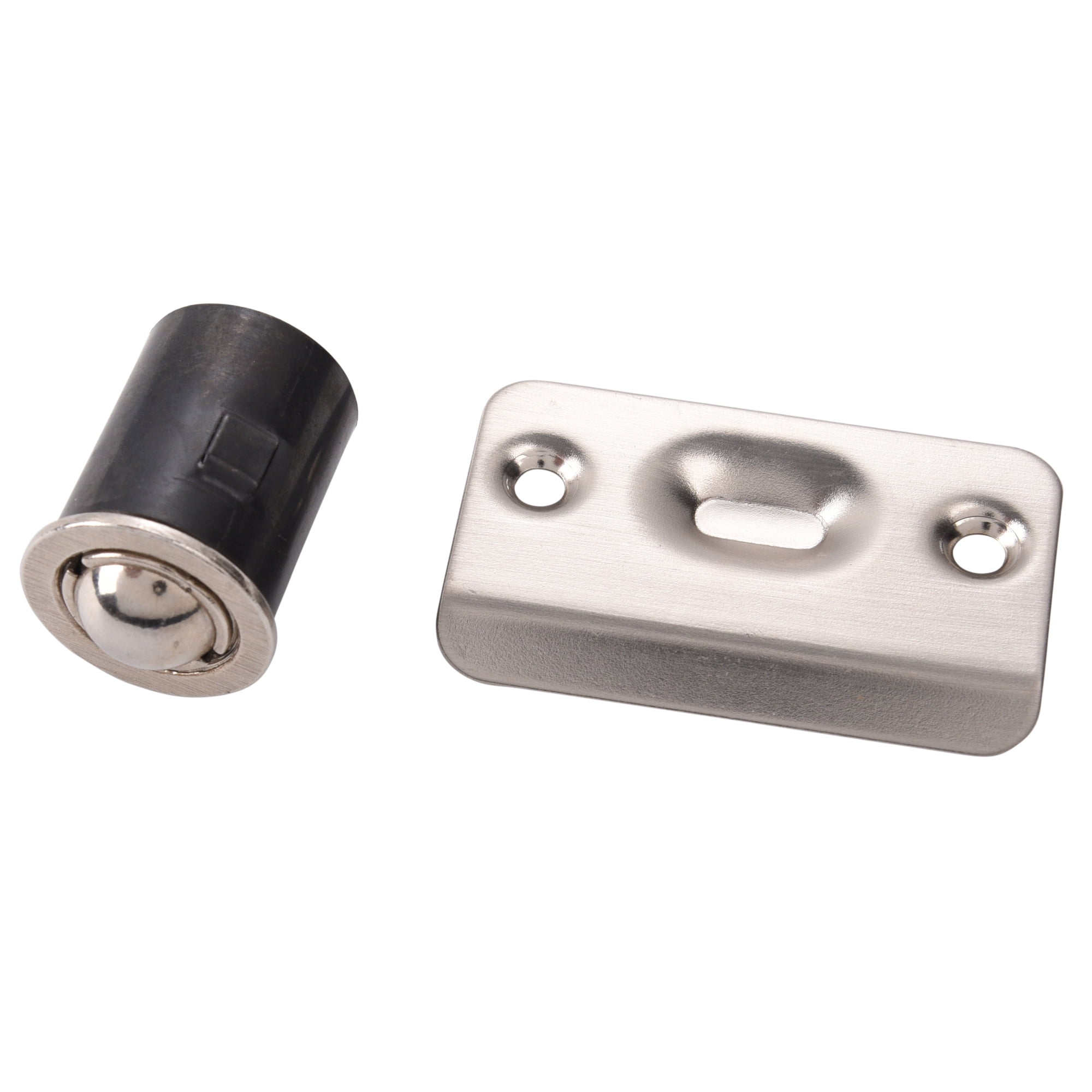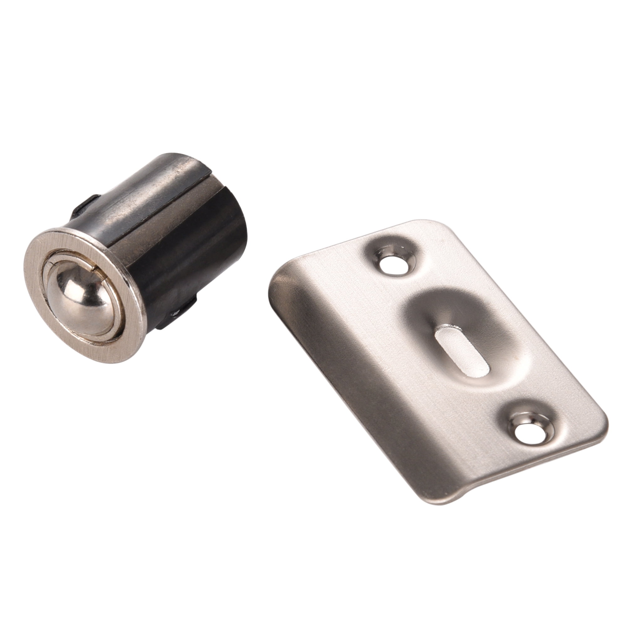 Ball Catches are designed to hold cabinet doors in the closed position. The spring loaded ball catch barrel is designed to be inserted into a 15/16" (23.8 mm) diameter bored hole to a minimum depth of 1-1/8" (28.6 mm). Catch includes a stamped steel strike plateLot of 4 61960 Closet Door Ball Catch Drive-in Satin Nickel SN Adjustable Steel