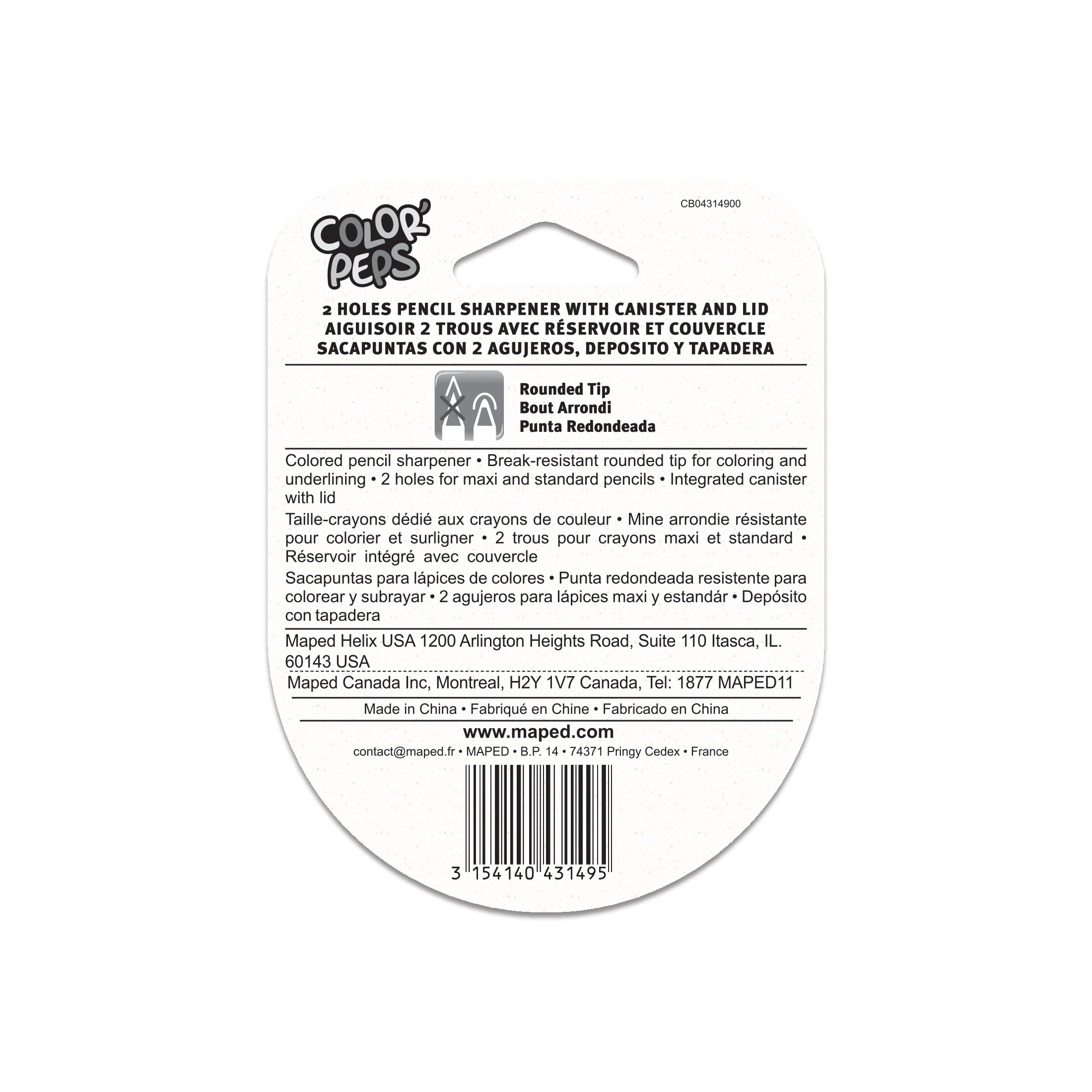 The Maped Color’ Peps 2 Hole sharpener is dedicated specifically to colored pencils! Designed to sharpen to a rounded tip which is safer for young children and reduces the chance of tearing when coloring on high-tooth paper. The two holes handle both standard size and maxi/jumbo sized colored pencils.