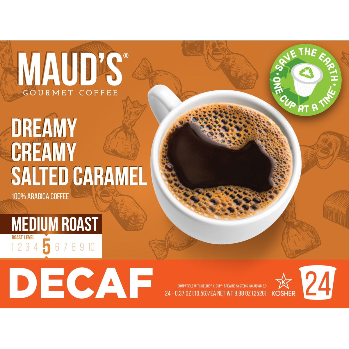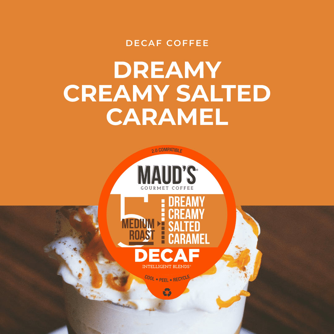 Maud’s "Decaf Dreamy Creamy Salted Caramel" is a delicious blend of medium roasted and flavored gourmet coffee. If you like creative flavor combinations, you’ll love this delightfully distinctive indulgence. Maud’s Coffee single serve coffee pods are K-Cup compatible and can be used with Keurig coffee makers (including 2.0 machines), making these a delicious and convenient option for the busy coffee drinker who wants real flavor in their morning cup. Our cups are eco-friendly and made from 100% recyclable #5 plastic, so you can enjoy each steamy mug knowing you’re doing something good for yourself, and the earth! Why not delight your senses with a truly aromatic and flavorful experience? Each single serve coffee pod is filled with perfectly ground 100% Arabica Coffee beans of the highest quality, including organic and fair trade beans from premier growing regions around the world. Your daily cup of coffee isn’t just a routine, it’s a moment to enjoy the little things in life. To ensure you get the best cup every time, we roast our beans in our own San Diego Facility, which means we can personally monitor the quality and character of each batch. Keurig and K-Cup are registered trademarks of Keurig Inc., a wholly owned subsidiary of Green Mountain Coffee Roasters, Inc. Intelligent Blends is not affiliated with Green Mountain Coffee Roasters Inc. or Keurig Inc.