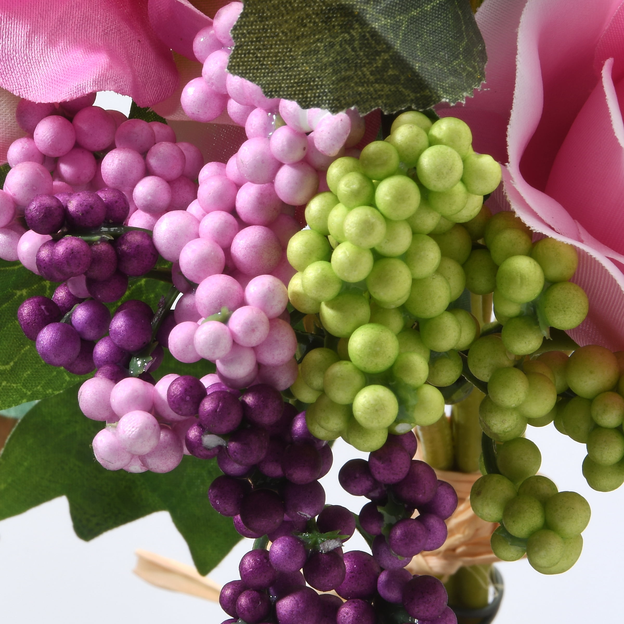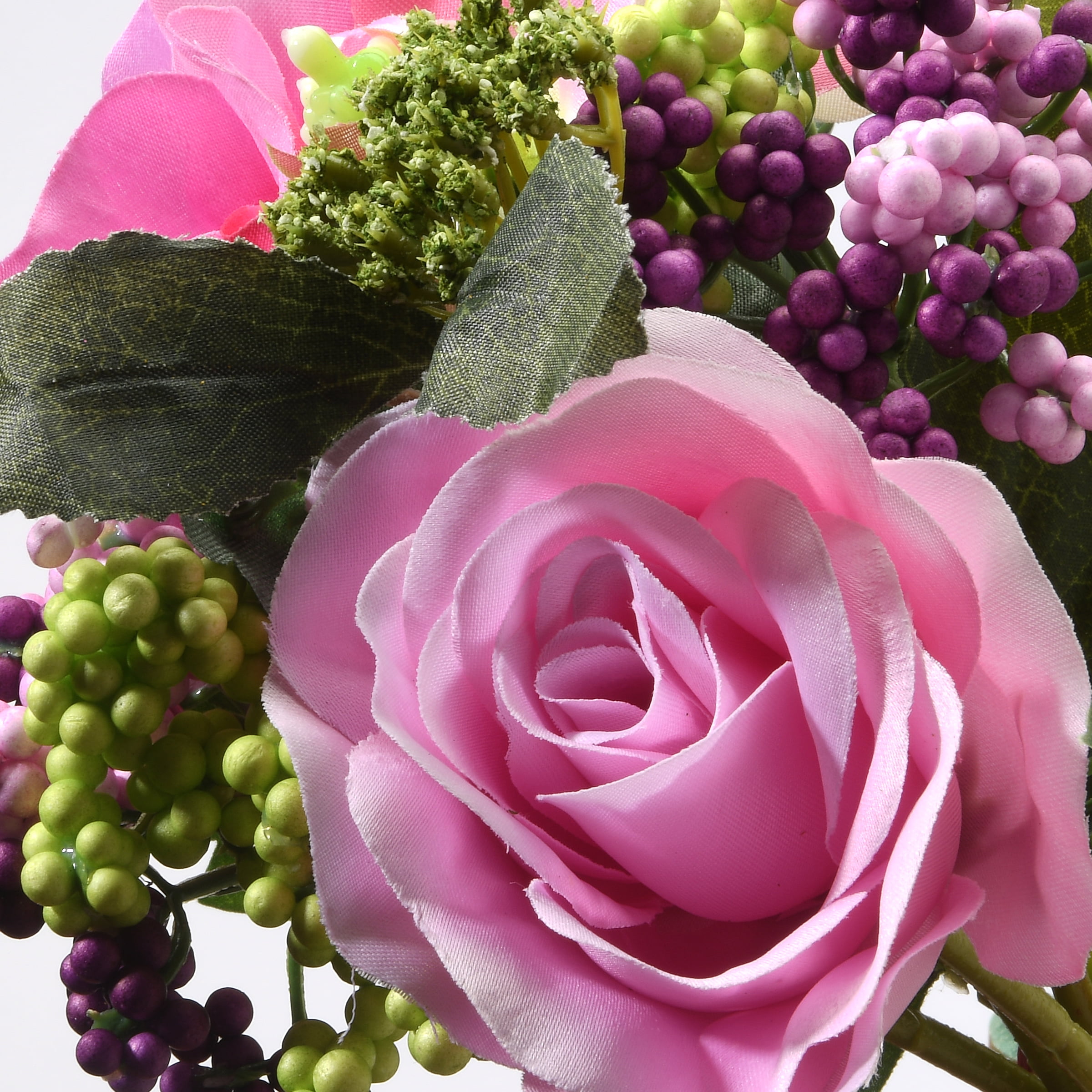 This bouquet features bright pink rose flower blooms, trimmed with berries and sitting on green leaves and long rigid stems. Insert these artificial flowers into a vase or planter to add a bright touch of color to your decorating scheme. A perfect trimming for welcoming the spring and summer seasons.