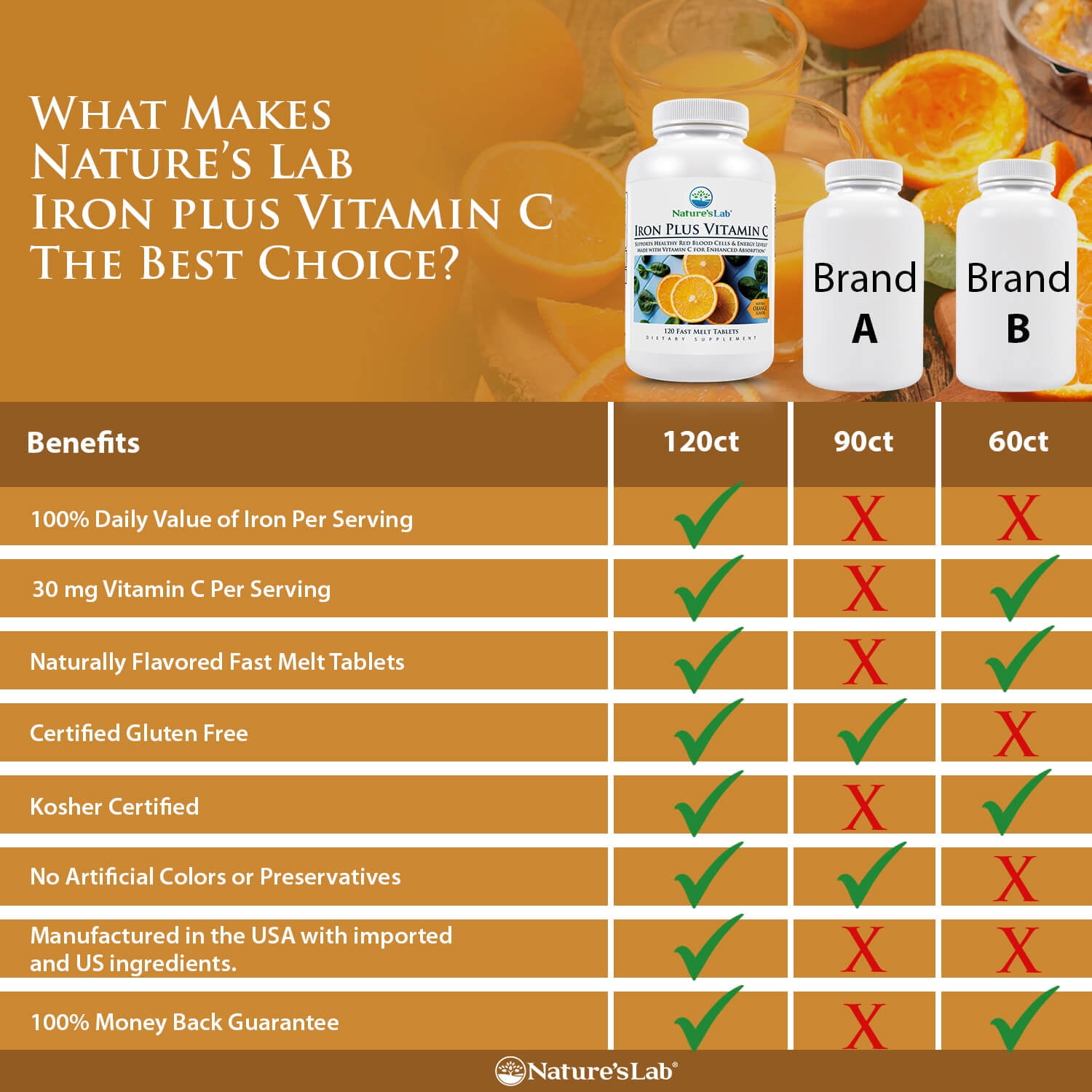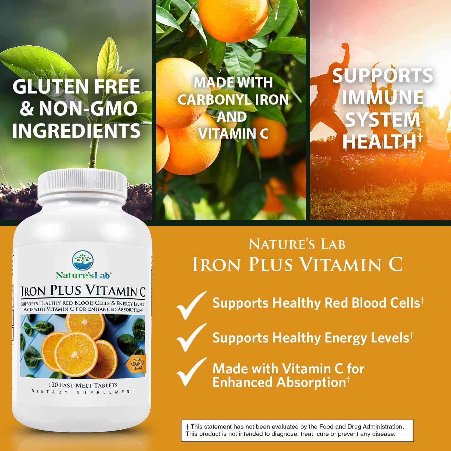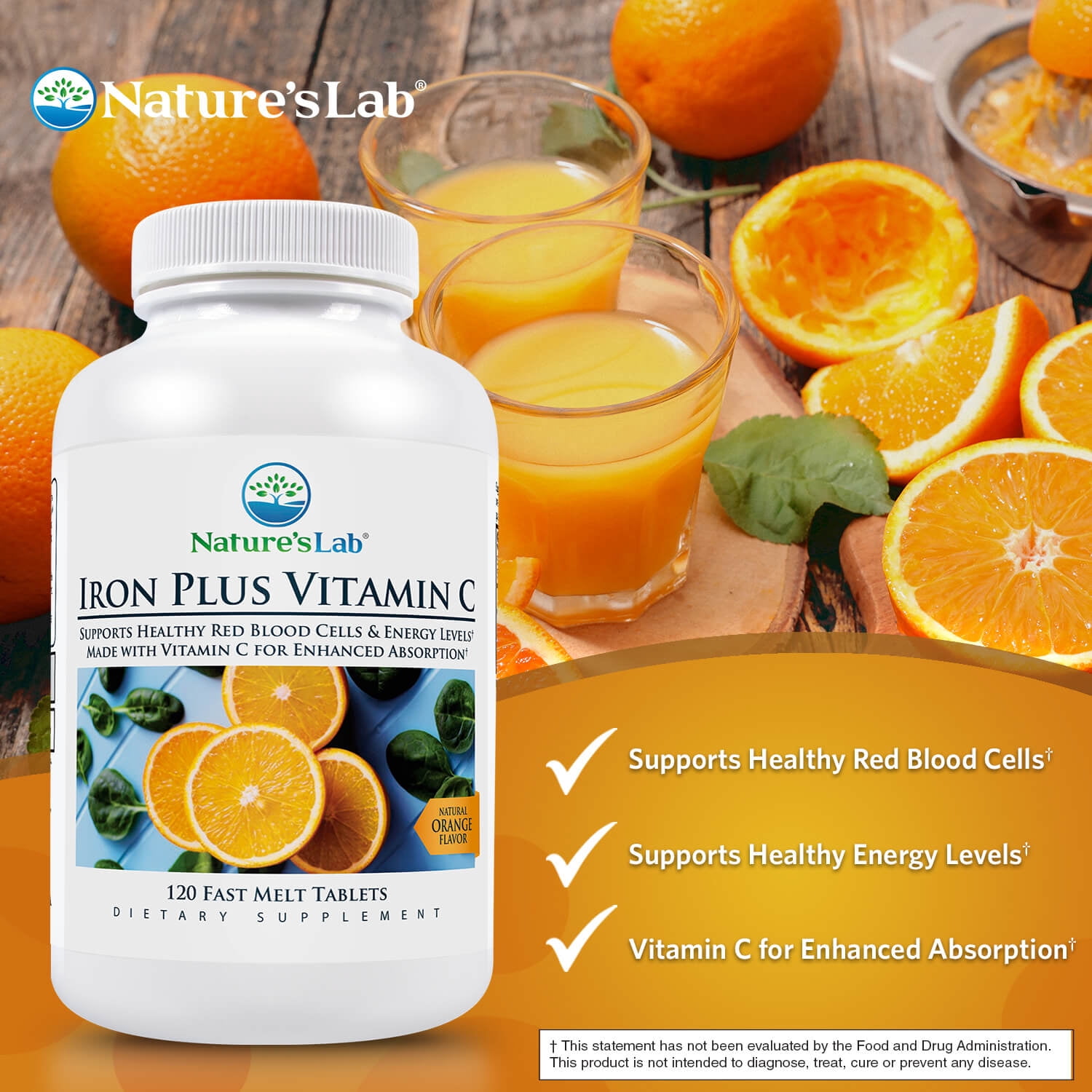 Nature’s Lab Iron Plus Vitamin C Fast Melt is a convenient way to increase iron intake with a gentle on the stomach formula.* Just one quick dissolve tablet provides 100% of the daily value for iron. Carbonyl iron has a high absorption rate while still being easy on the digestive tract.* Adding vitamin C increases the bioavailability of this iron supplement further.* Iron is an essential mineral that cannot be created within the body. To avoid iron deficiency it’s crucial to obtain this vital nutrient from outside sources.* Nature’s Lab Iron Plus Vitamin C fast melt is a daily iron supplement formulated with a jolt of vitamin C to help your body more readily absorb this essential mineral.*
