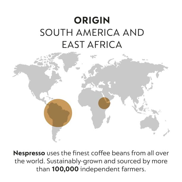 Product details A balanced marriage between South American Arabicas cultivated at high altitude, among which “Cerrado” from Brazil & an East African Arabica. It combines roasted & subtle floral notes. Split roasting of the beans enhances the character of each origin. Nespresso capsules are fully recyclable through Nespresso’s free recycling program. Through Nespresso’s AAA Sustainable Quality Program, we pay above-market prices for coffee, and invest in social programs such as pensions and insurance, to ensure coffee farming is a profitable business for future generations. COFFEE BLEND: A fruity espresso blend for the Nespresso Original Line system COFFEE ORIGIN: South American and Ethiopian Arabicas ROASTING: Split-roasted – Nespresso Intensity 4 CONTENTS: 40 capsules – 10 capsules per box. Each capsule brews 3.7 oz. espresso WE RECYCLE: Aluminum capsules ensure 100% recyclability and assure coffee freshness ORIGINAL LINE ONLY: Capsules are not compatible with Vertuo Line machines.Product details A balanced marriage between South American Arabicas cultivated at high altitude, among which “Cerrado” from Brazil & an East African Arabica. It combines roasted & subtle floral notes. Split roasting of the beans enhances the character of each origin. Nespresso capsules are fully re