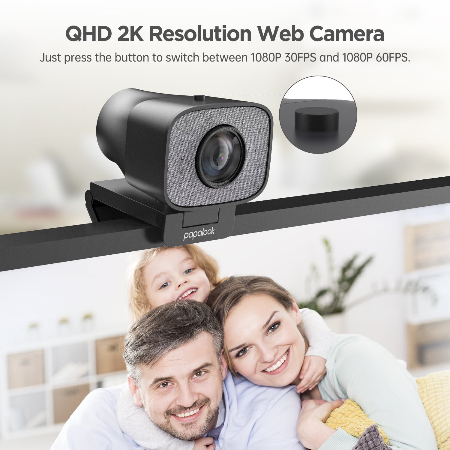 - 2K Resolution Video Computer Web Camera: The formats of 2K resolution in video and images are Quad HD 2560*1440P (up to 30fps) and Full HD 1920*1080P (up to 60fps). There is a frame rate switch button on the top of the camera, which supports switching between 30FPS and 60FPS of 1080P, 720P and 480P resolution.