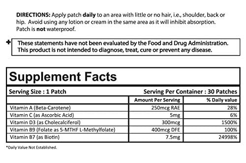 Biotin is an important B-Vitamin known to support healthy hair, skin and nailsDIRECTIONS Apply biotin patch daily to an area with little or no hair, i.e., shoulder, back or hip. For best results, it is recommended to wear PatchMD patches for 8 hours. There is no additional benefit wearing the patch longer than 8 hours. Patches can be worn during sleep. Avoid using any lotion or cream in the same area as it will inhibit absorption. The biotin patch is not waterproof. It is ok to wear multiple patches at a time.