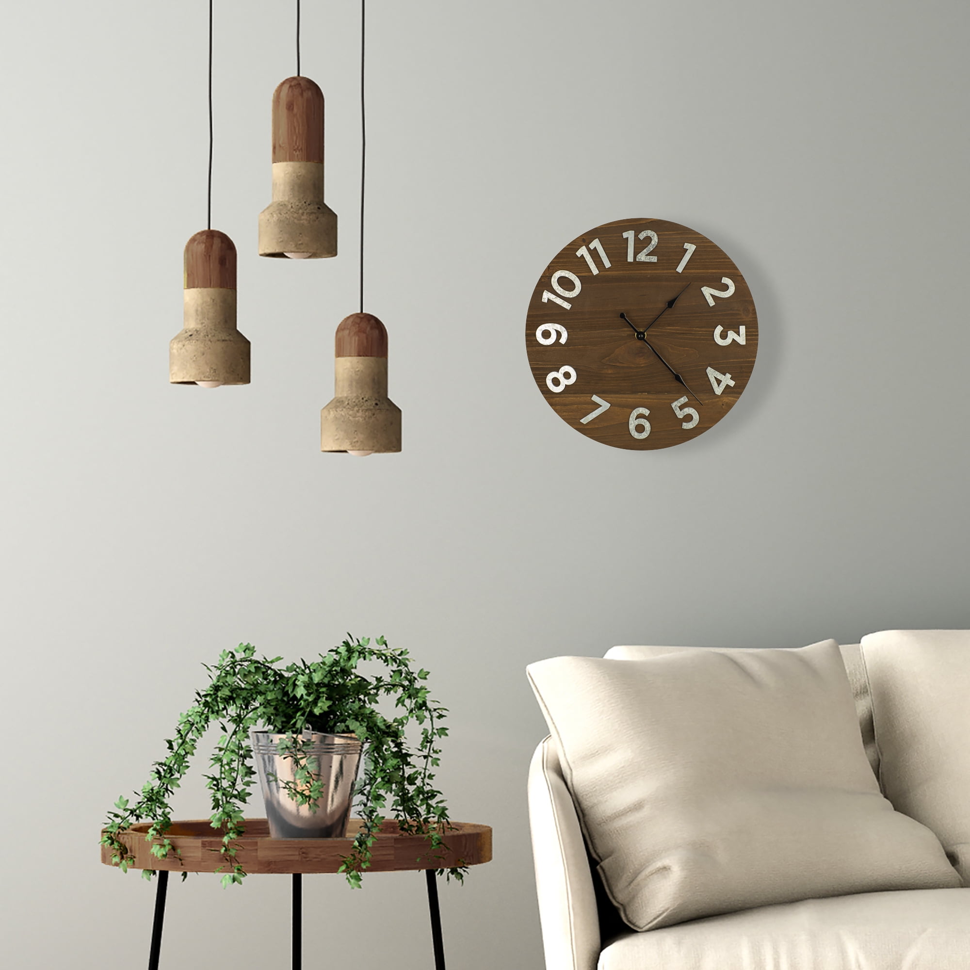 Going along with the popular farmhouse theme, this walnut wood plank clock will coordinate with any furniture finish, from white and grey, to black and brown. The rich walnut wood background blends perfectly with the galvanized metal numbers. The 12 inch size make it a perfect fit for your office, kitchen, or entryway.