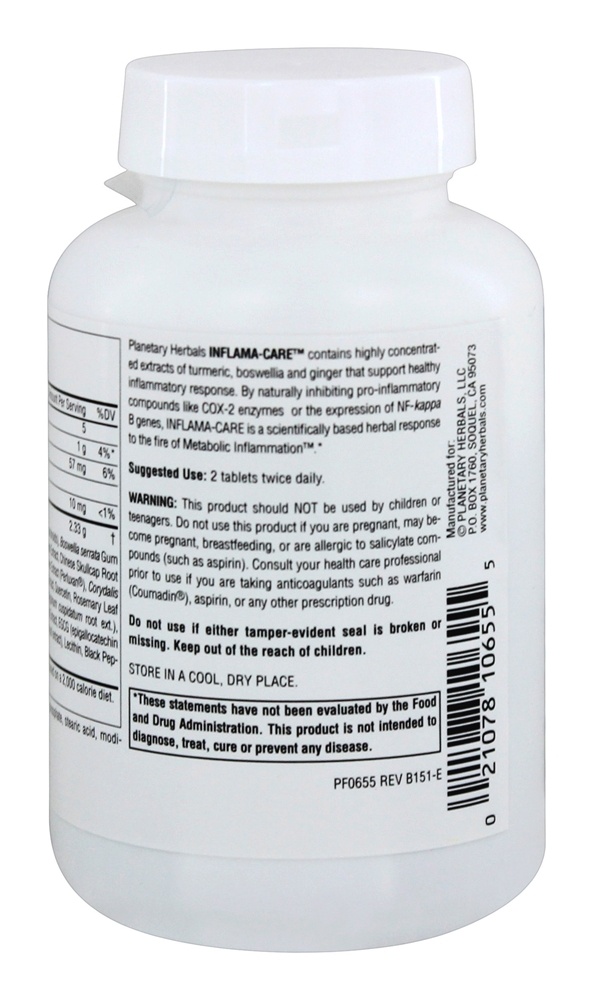 Planetary Herbals – Inflama-Care Turmeric/Boswellia Complex 1165 mg. – 60 Tablets Planetary Herbals Inflama-Care Turmeric/Boswellia Complex contains highly concentrated extracts of turmeric, boswellia and ginger that support healthy inflammatory response.