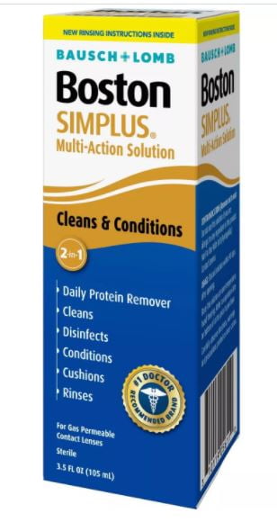 Boston SIMPLUS Multi-Action Solution is a one-bottle cleaning, disinfecting and conditioning product that has the added convenience of a built-in protein remover and easy-to-use no evening rub lens care regimen. Rub and rinse prior to lens wear. Performance and Convenience for Today’s Busy Gas Permeable Lens Wearer.