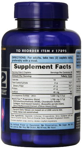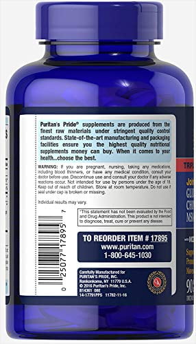 For some that could mean daily walks, for others a rigorous yoga practice. Or it could be as simple as being out and about running errands. But no matter what it is that has you on the move, one thing is true: You’ll want to take care of your joints so that you can remain active.One way to do that is with Puritan’s Pride Joint Soother®, which contains Glucosamine, Chondroitin and MSM—three popular ingredients that work together to support joint health.**These three ingredients are key structural components in the cartilage in your joints.** Glucosamine and Chondroitin are part of the complex connective tissue matrix that is responsible for cushioning joints and bones, working together to support the structural framework of joints.** Meanwhile, MSM, a source of sulfur, supplies a vital ingredient that helps support healthy connective tissue.**Because your joints absorb a lot of stress when you move, making sure your cartilage stays healthy is crucial in maintaining your comfort. Puritan’s Pride Joint Soother® with Glucosamine, Chondroitin and MSM is one of our most sought-after joint care formulas, supporting your joint comfort, mobility, and flexibility for comfortable movement.**Directions: For adults, take two (2) caplets daily, preferably with a meal.Other Ingredients: Vegetable Cellulose, Povidone. Contains <2% of: Crospovidone, Malodextrin, Natural Caramel Color, Natural Palm Leaf Glaze, Silica, Polysorbate 80, Titanium Dioxide Color, Triacetin, Vegetable Magnesium Stearate. Vegetable Stearic Acid. Contains shellfish (crab, shrimp, lobster, crayfish) ingredients.WARNING: If you are pregnant, nursing, taking any medications, including blood thinners, or have any medical condition, consult your doctor before use. Discontinue use and consult your doctor if any adverse reactions occur. Not intended for use by persons under the age of 18. Keep out of reach of children. Store at room temperature. Do not use if seal under cap is broken or missing. Individual results may vary.No Artificial Flavor or Sweetener, No Preservatives, No Sugar, No Starch, No Milk, No Lactose, No Soy, No Gluten, No Wheat, No Yeast.Dairy Free,Gluten Free,Lactose Free,Sugar Free,Unsweetened,Yeast Free
