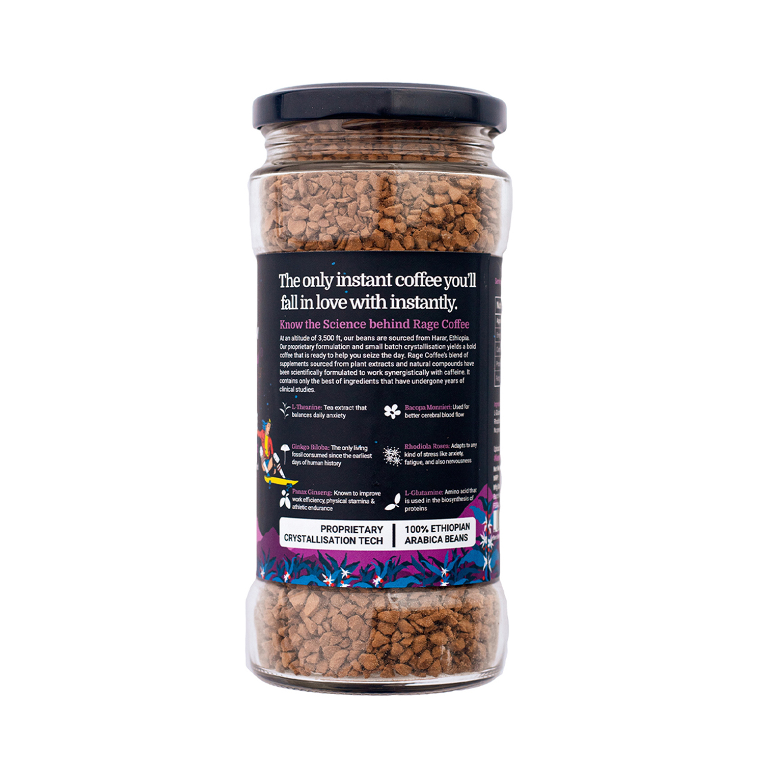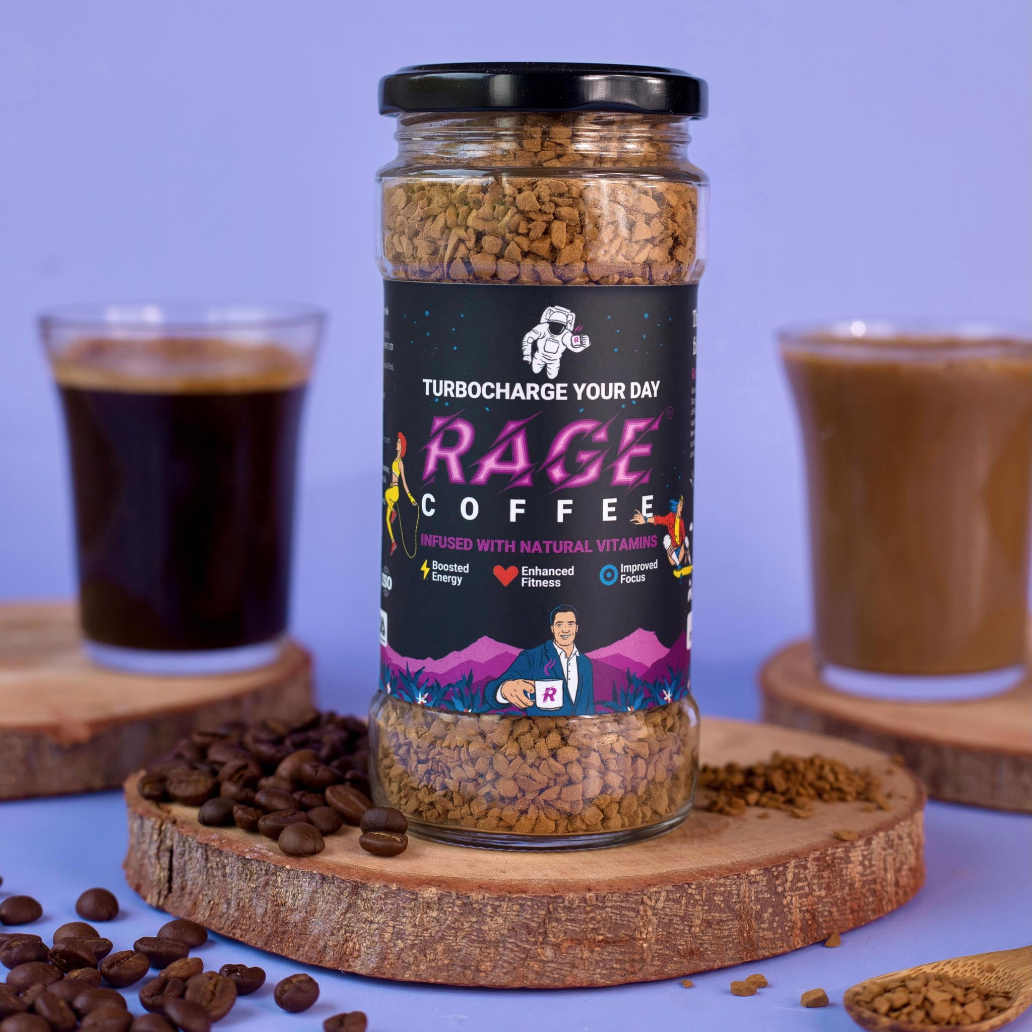 Turbocharge your day with Rage Coffee! The only instant coffee youâll fall in love with instantly 100% natural plant based vitamins blend 100% Arabica beans Proprietary small batch crystallisation technology Keeps you fuelled all day long Enhanced athletic performance, Heightened cognitive function & a sustained burst of energy Our beans are carefully selected & expertly roasted and crystallized to give you that caffeine kick, bold taste, and great aroma that thousands of people have come to love! Why we created Rage Coffee? We love coffee and we were looking for a more intense kick without doing all the hard work of brewing that perfect cup and without a lot of caffeine. We spent over 6 months and developed 85 (maybe more) prototypes to hit the perfect formulation. We combined some of the most potent natural vitamins and herbal extracts, with highest quality coffee beans grown in Ethiopia to create the best coffee stack available on the market! The functioning of the brain is mainly dependant on the electrical activities that occur within the brain cells. Rage Coffee promotes healthy electrical activity in the brain, thereby leading to a well-coordinated brain function. All natural plant based! Know the Science behind Rage Coffee Our proprietary formulation and small batch crystallisation yields a bold coffee that is ready to help you seize the day. Rage Coffeeâs blend of supplements sourced from plant extracts and natural compounds have been scientifically formulated to work synergistically with caffeine. It contains only the best of ingredients that have undergone years of clinical studies.Made using 100% Arabica beans and infused with high-quality natural flavourings
