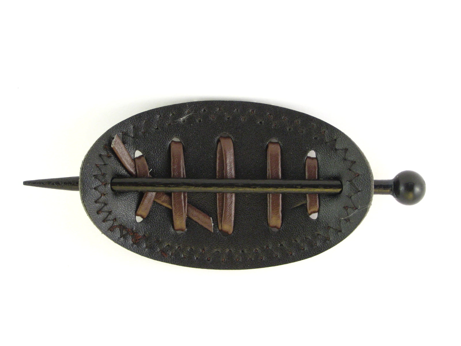 Pastel Oval Leather With X Stitched Pattern & Wood Hair Barrette Stick – Dark Brown