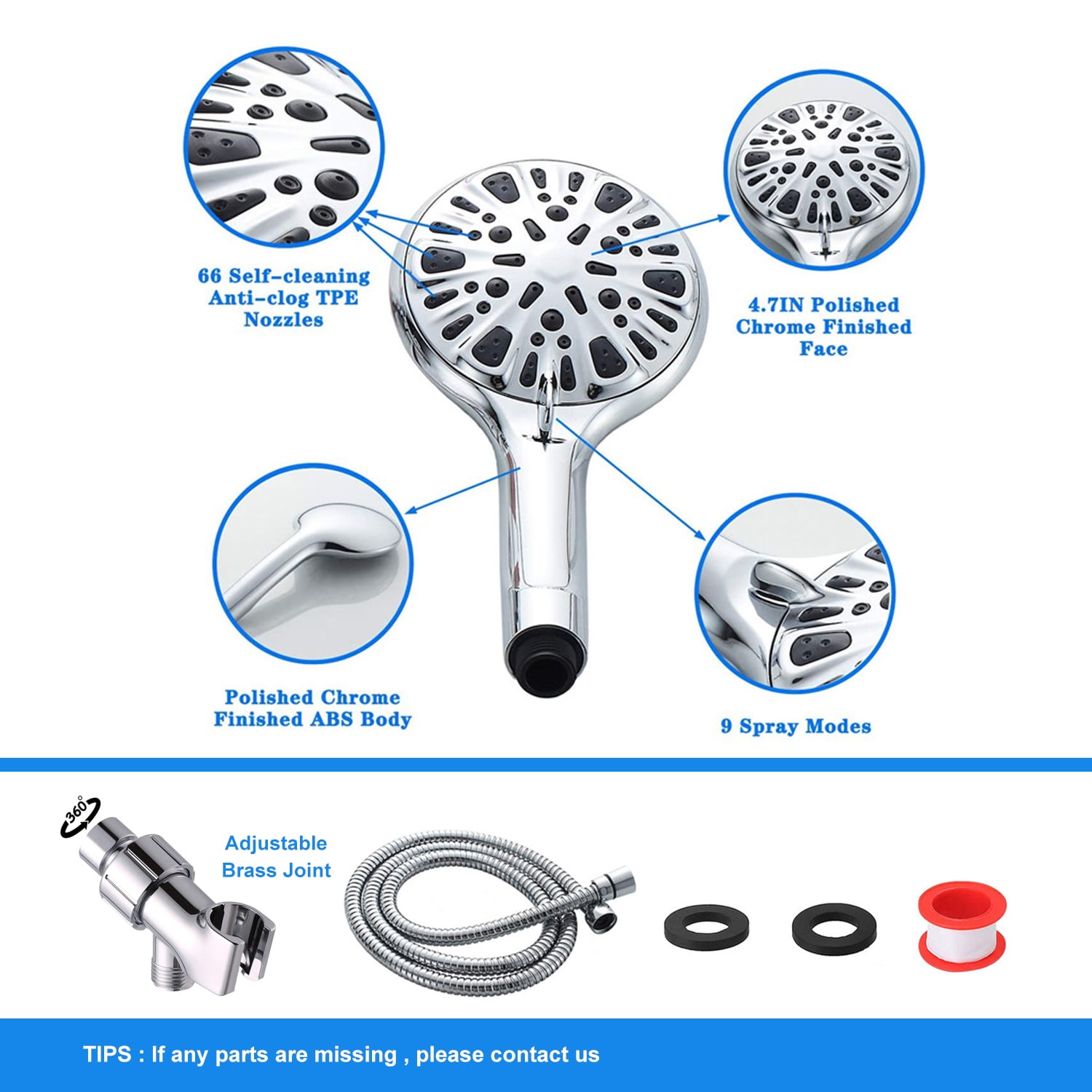 - 【4.9-inch Easy Clean Chrome Panel】The adjustable shower head has a 4.9-inch panel with 66 self-cleaning nozzles for easy maintenance. The water outlet is not easy to be blocked after long-term use.