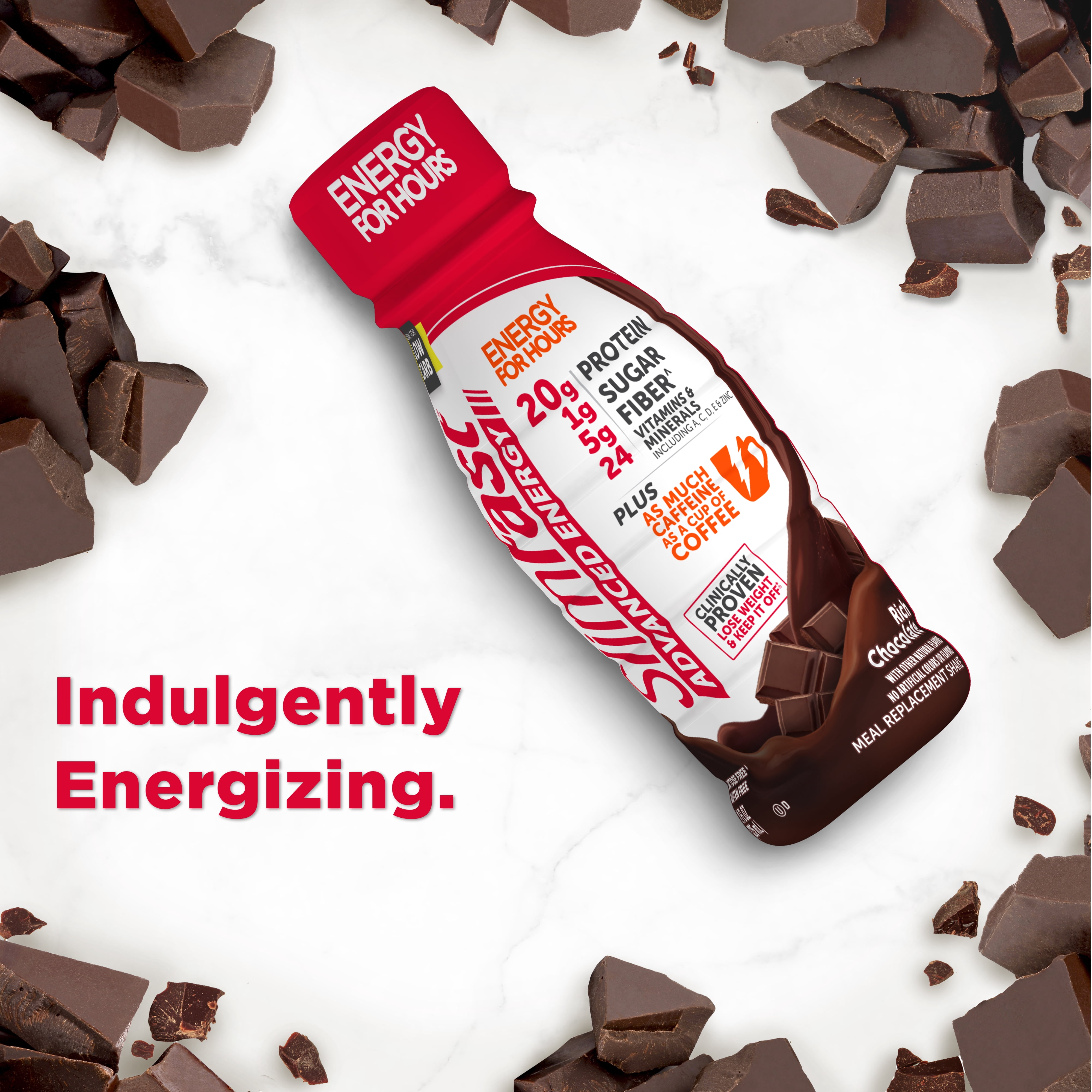 Shake up your morning routine and give your weight loss a caffeine kick with Advanced Energy Rich Chocolate Meal Replacement Shake. With as much caffeine as a cup of coffee, this naturally-flavored, gluten free and ready-to-drink shake for chocolate lovers is deliciously convenient. Fuel up with 20g of protein, 1g of sugar, 5g of fiber, 24 vitamins (including A, C, D, E) and minerals plus zinc. It’s the decadent chocolatey shake that helps you stay on track. Part of the clinically proven SlimFast Plan, these shakes make weight loss as easy as 1-2-3. Enjoy one sensible meal, two SlimFast meal replacements and three snacks. Lose Weight & Keep it Off with the SlimFast Plan!