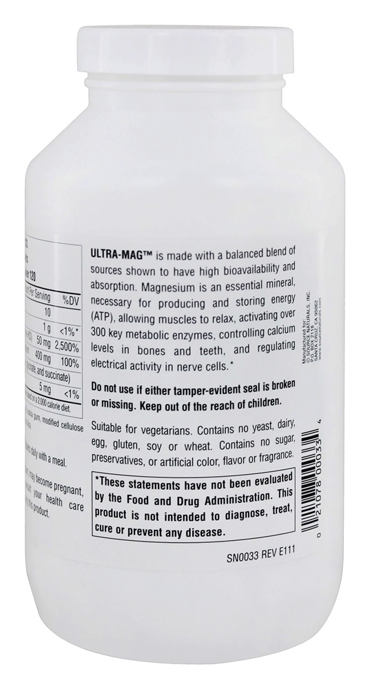 Ultra-Mag Hi Efficiency Magnesium by Source Naturals Inc. 240 Tablet Ultra-Mag Hi Efficiency Magnesium 240 Tablet Product Ultra-Mag is made with a balanced blend of sources shown to have high bioavailability and absorption. Magnesium is an essential mineral necessary for producing and storing energy (ATP) allowing muscles to relax activating over 300 key metabolic enzymes controlling calcium levels in bones and teeth and regulating electrical activity in nerve cells. Suggested Use As a dietary supplement take 1 or 2 tablets daily with a meal. – Or as directed by your healthcare professional. Supplement Facts Serving Size 2 Tablets Servings Per Container 120 Amount Per Serving Daily Value Calories 10 Total Carbohydrate 1 g 1 Vitamin B6 50 mg 2 500 Magnesium (as magnesium citrate taurinate malate glycinate and succinate) 400 mg 100 Sodium 5 mg 1 Percent Daily Values are based on a 2 000 calorie diet Other Ingredients Stearic acid acacia gum modified cellulose gum magnesium stearate.