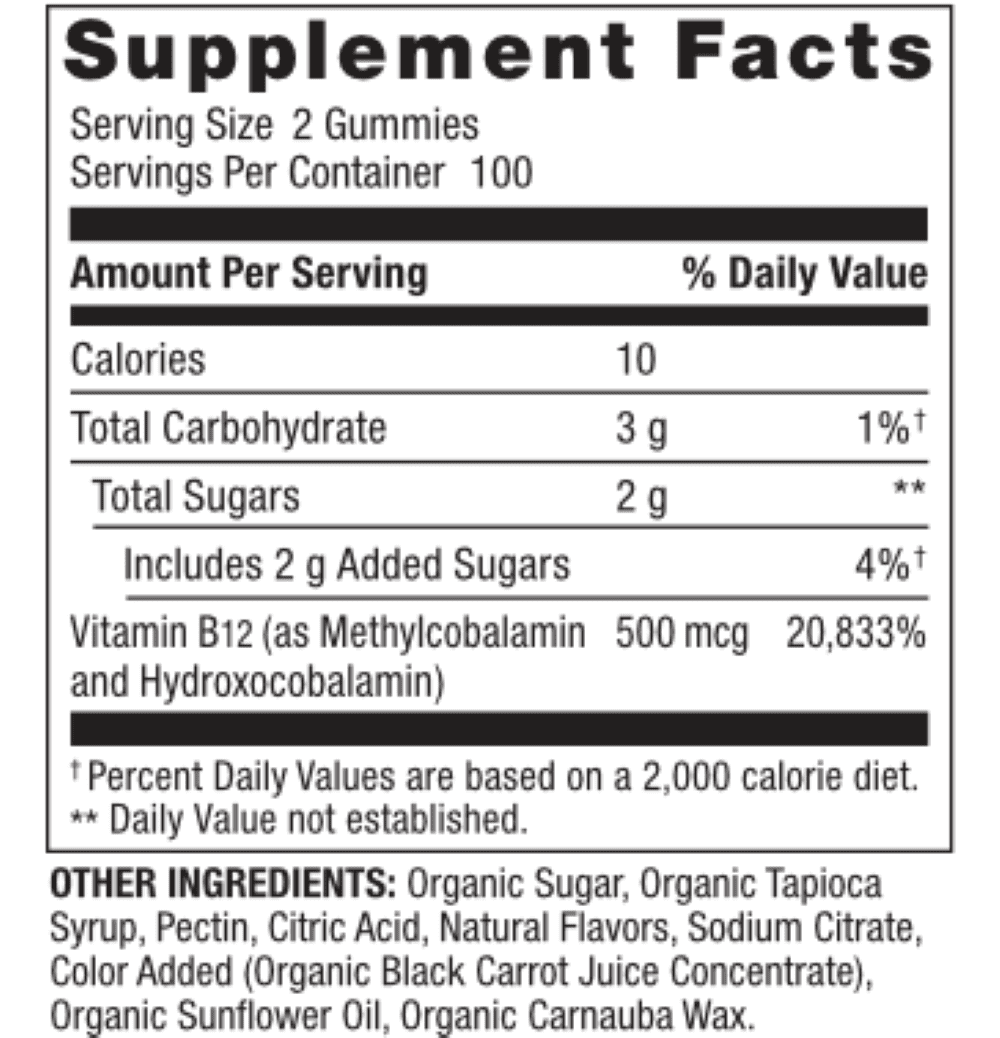 Spring Valley Organic Vegetarian Vitamin B12 Gummies are the simplest, best-tasting way to support energy metabolism. Our delicious and easy to chew gummies make taking your daily Vitamin B12 a joy. Spring Valley understands living a healthy, balanced lifestyle is the key to being your best self. With a commitment to using only the highest quality ingredients, Spring Valley gummies are a simple and delicious addition to your daily routine that you can feel good about. Our affordable range of high-quality products supports you and your family’s health and holistic wellbeing. Organic and Non-GMO, Spring Valley Organic Vegetarian Vitamin B12 Gummies have been specifically formulated with Methylcobalamin to support energy metabolism. Methylcobalamin is an active form of Vitamin B12 that supports energy metabolism and plays an important role in the formation of red blood cells.