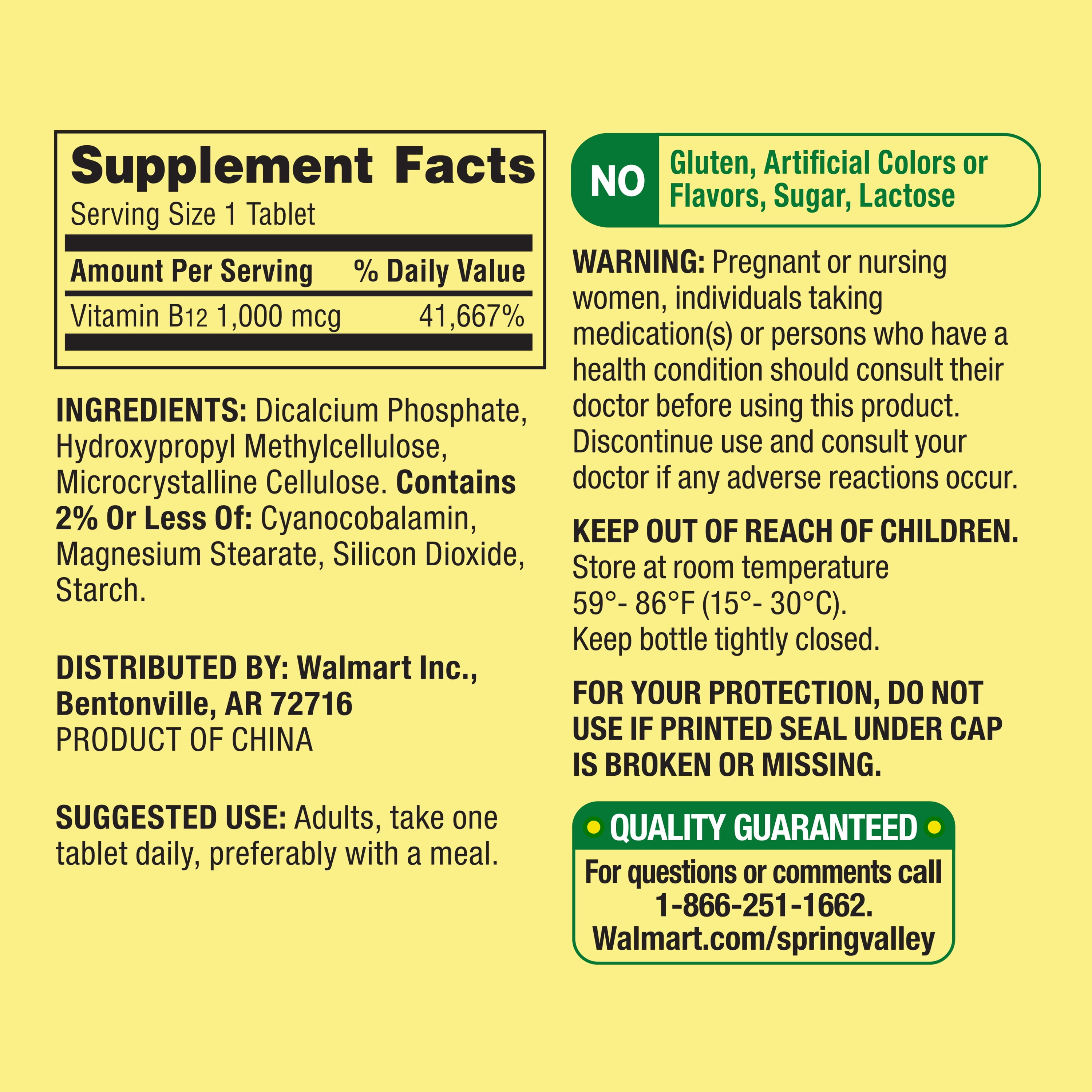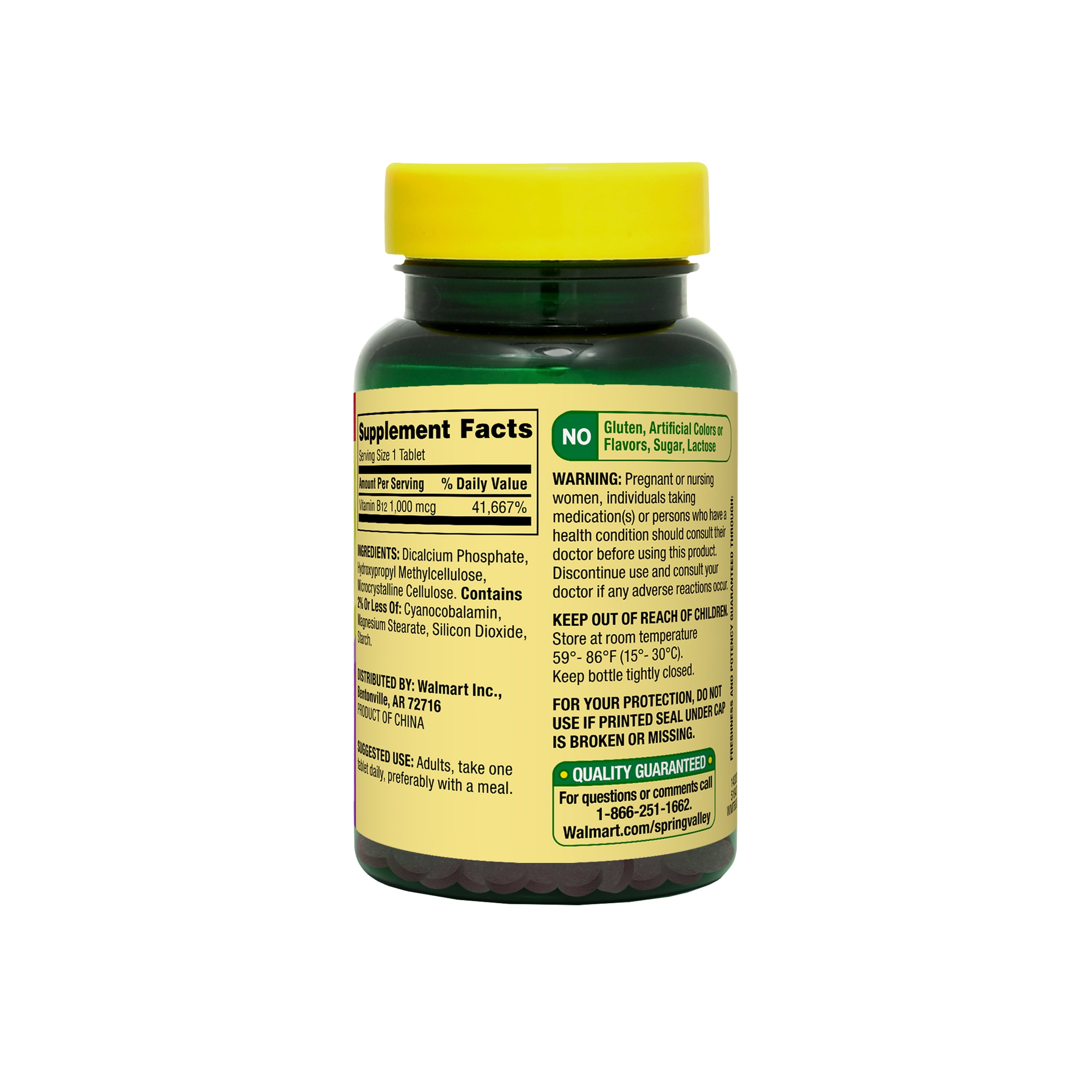 Our Spring Valley Vitamin B12 Timed-Release Tablets Dietary Supplement Value Size, 1,000 mcg is formulated for metabolism support.* Each tablet delivers 1,000 mcg of vitamin B12. Vitamin B12 aids in energy production and also supports cardiovascular, immune, and nervous system health.* This formula gradually releases vitamin B12 over a period of time for better absorption. It is also free of gluten, sugar, lactose, artificial colors and flavors. You can rest assured that Spring Valley Vitamin B12 Timed-Release Tablets Dietary Supplement Value Size, 1,000 mcg is produced with strict quality guidelines and is backed by our quality guarantee.
