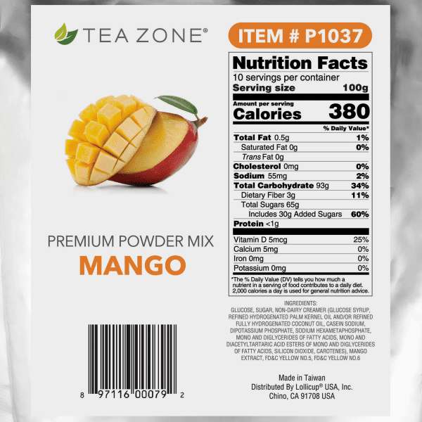 Tea Zone Mango Powder is a premium powder mix great for making smoothies, milk teas, flavored milk, and various blended drinks. With many natural flavors to select from, Tea Zone premium powders are securely sealed and designed to be resealable after opening to maintain the quality of the powder. To ensure uncompromised and sanitary usage, powders should be stored in a vacuum sealed power container and always use a dry, clean powder scoop. Packaging design may differ from the product photo.