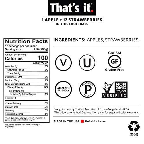 JUST APPLE + STRAWBERRY SERIOUSLY, THAT’S IT! We’re packing 2 REAL fruit servings in a delicious, chewy fruit bar that delights your taste buds and provides your body the daily nutrition it needs. No preservatives, added sugar, concentrates or purees. Just 100% delicious.HEALTHY SNACKING ON THE GO: 87% of Americans are not getting their daily recommended fruit intake, so toss That’s It. Fruit Bars in your gym bag or child’s lunchbox for balanced nutrition on-the-go, or try infusing with other recipes. Great for weight management, these bars are only 100 calories and contain vitamins A and C, 3g fiber, and are the purest alternative to nearly every bar, snack, juice, granola, fruit strips, fruit bits, and dried fruit.2-YEAR SHELF LIFE: An estimated 60% of all produce is wasted each year due to spoilage, fruit bugs, peelings, etc. so all of our fruit bars have a sustainable shelf life of 2 years. We’re taking the wash, peel, cut, wasteful hassle out of produce, and conveniently integrating real fruit into every lifestyle in a way that is fresh, delicious, and safe for you.100% NATURAL: Ingredient lists have never been this simple and clean. Made in an allergen-free facility, That’s It. Fruit Bars are nut free, fat-free, non-GMO soy free, pesticide free, diabetic friendly including Vegan, Paleo & Kosher.TRY THEM ALL: We make it convenient and fun to get your two whole servings of fruit just from one That’s It. Fruit Bar. No washing or peeling required, try from a variety of combinations from Apple to Apricot, Banana, Blueberry, Cherries, Coconut, Mango, Pineapple, or Strawberry.Flavor Strawberry Ingredients Apples, Strawberries Brand That’s it. Allergen Information Nut Free, Soy Free, Gluten Free, Apple, Banana Package Type Pouch