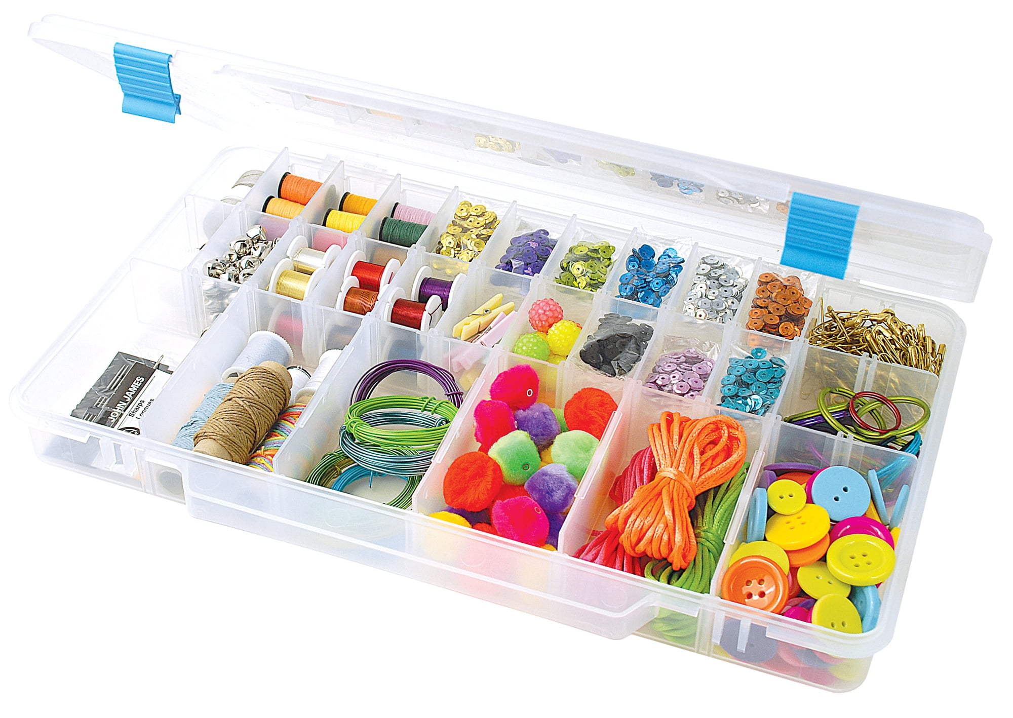 The Beadery Large Utility Organizer Box features adjustable compartments. It includes inserts that allow you to customize the inner compartments! Use the included inserts to create 3-28 compartments to meet your storage needs. This storage box includes a built in handle and hinged lid. The blue latches keep your storage box closed when not in use. This storage box can be used to organize your child’s play room, your crafting area, or your garage! The Beadery manufactures its storage boxes in the USA. This item is recommended for ages 6+. Made from clear plastic.