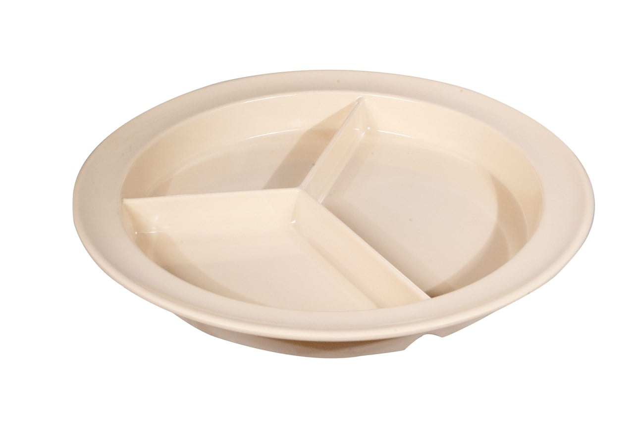 Three separate food compartments have raised sides approximately 1 deep to push fork or spoon against. Less spills, less mess and more food going to where it belongs – your mouth Very helpful for anyone with mobility issues such as arthritis, etc. Made of sturdy Melamine plastic. 9 diameter. Dishwasher safe; not microwaveable.