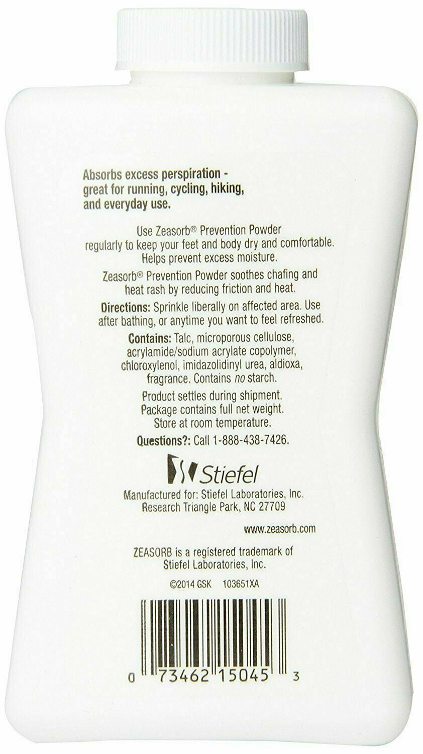 N/AZeasorb super absorbent powder prevents unwanted moisture that can lead to athlete’s foot, jock itch, ringworm and frictional skin irritation. It absorbs 3 times more moisture than plain talcum powder.