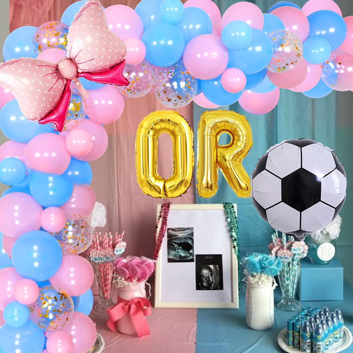 Soccer or Bows Gender Reveal Party Supplies Decorations, Blue Pink Balloon Garland Arch Kit with Football Bow Balloons Foil Fringe Curtains for Baby Shower Gender Reveal Party Set