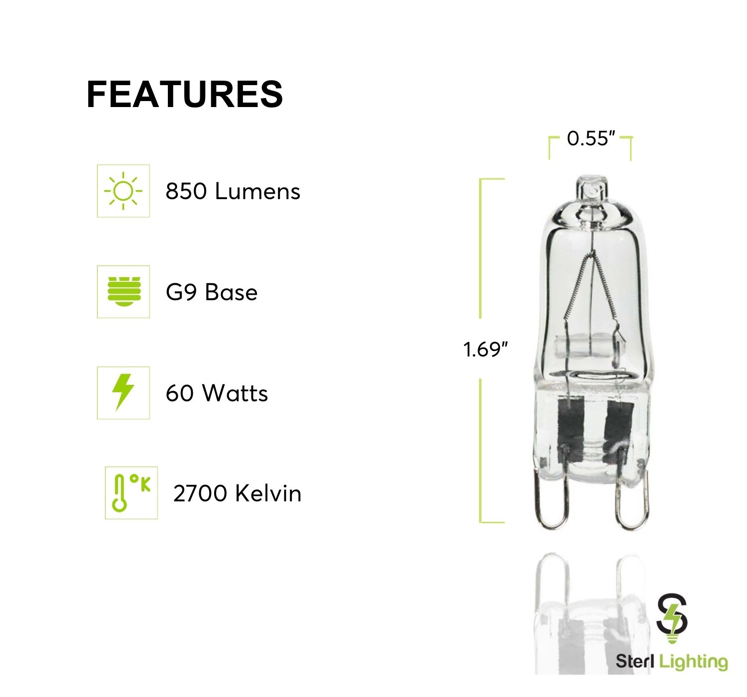 Sterl Lighting – Pack of 10 T4 JCD Type Clear Halogen Track Lighting Halogen Bulb, 60 Watt, 120V, G9 Bi-Pin, 2700K, 850 Lumens, 2000 Hours