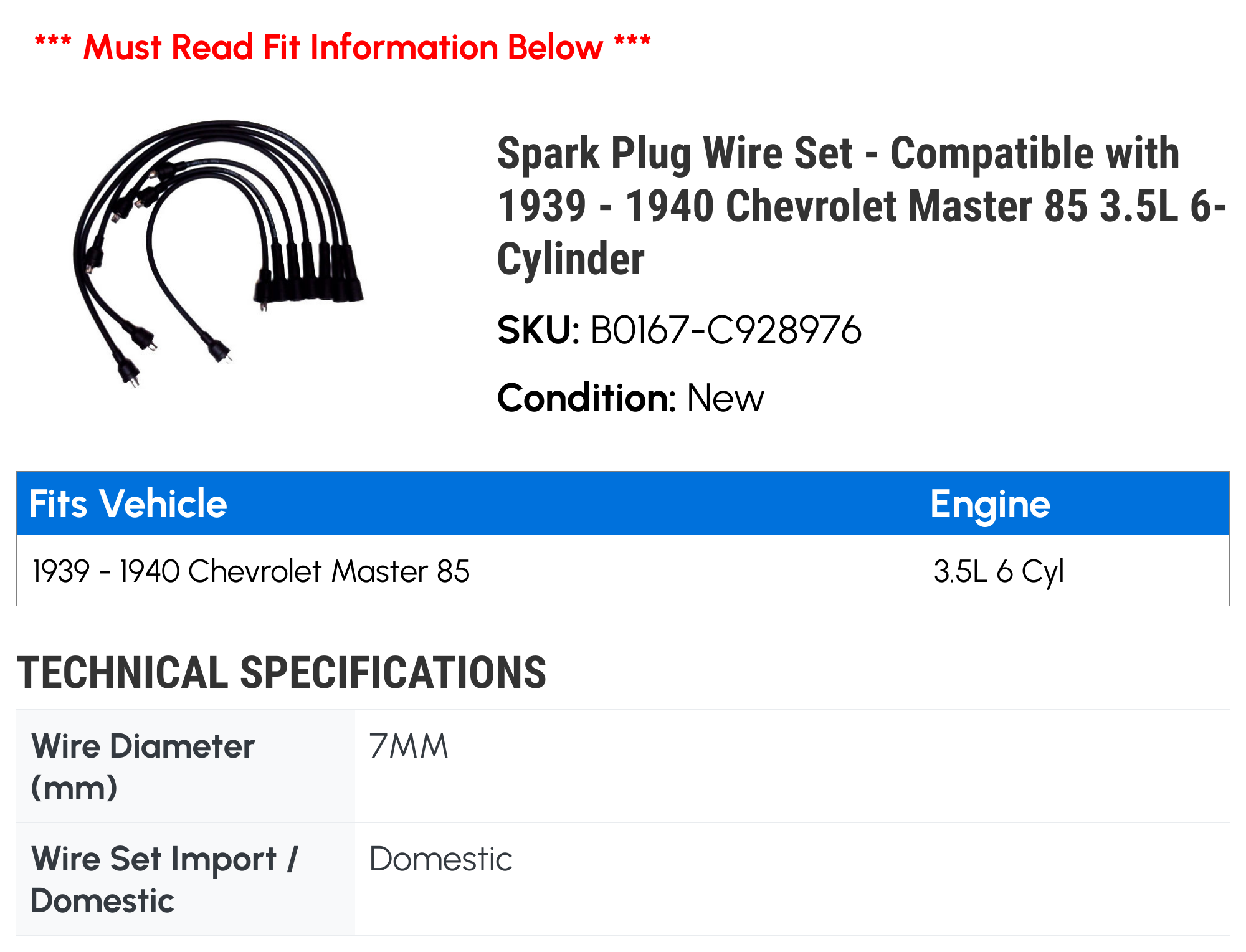 Spark Plug Wire Set – Compatible with 1939 – 1940 Chevy Master 85 3.5L 6-Cylinder