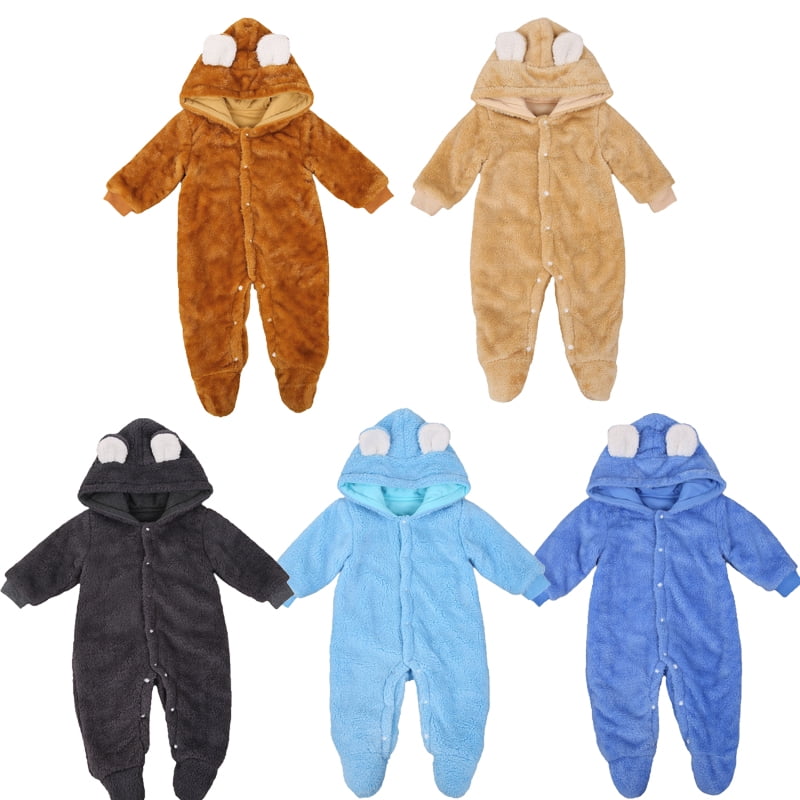 Winter Cute Baby Long Sleeve Jumpsuit Plush Single-breasted Bear Ear Hooded Long Pants Footies