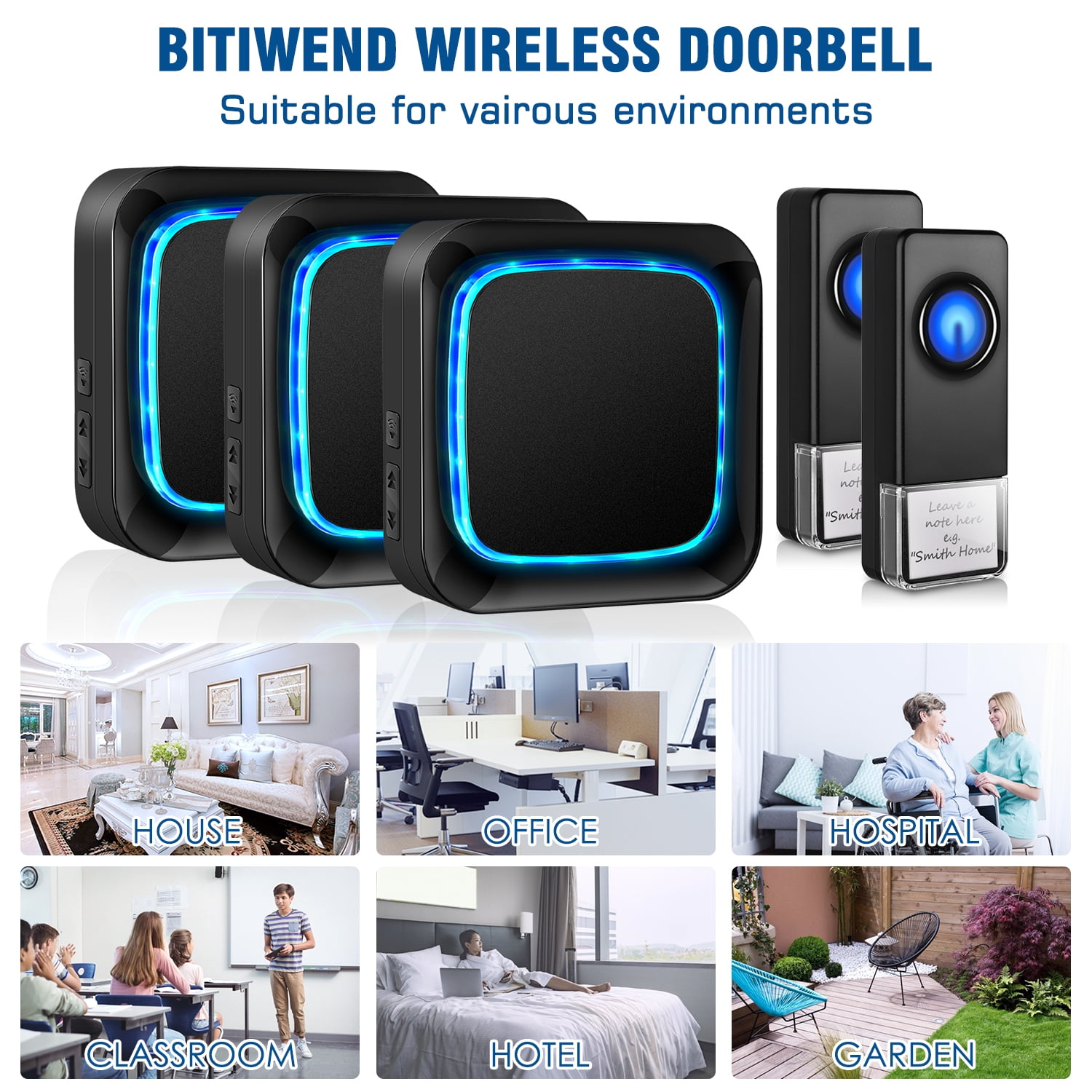 Bitiwend Wireless Doorbells for Home,3 Receivers 2 Buttons,58 Melodies Chimes,5 Level Volume,1000ft Long Range