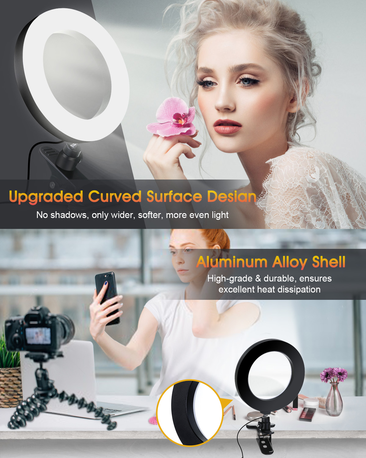 Video Conference Light, 6.3 inches LED Selfie Ring Light kit with Clamp Mount, Dimmable LED Ring Light