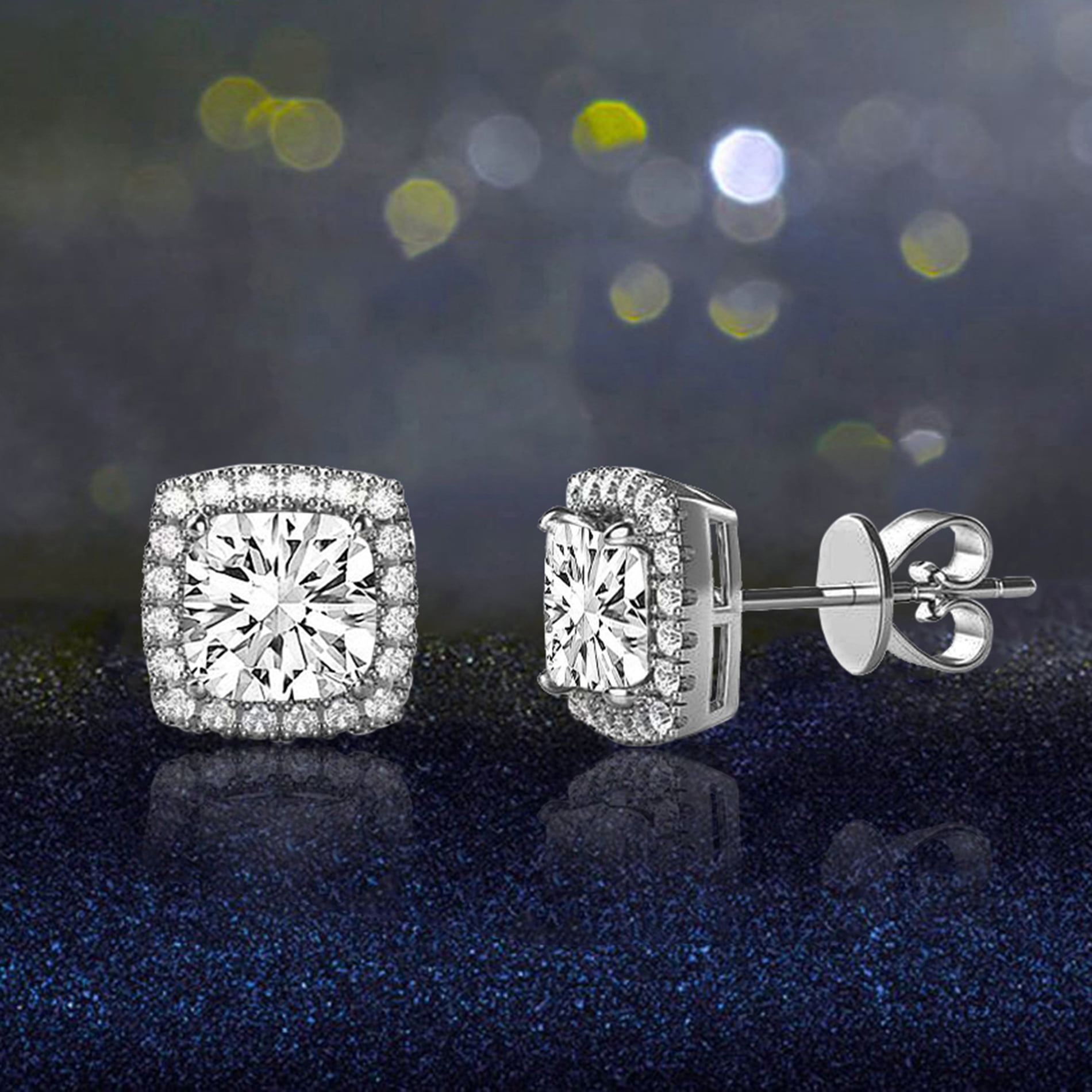 Lesa Michele Halo Cubic Zirconia Square Earrings in Rhodium Plated Sterling Silver for Women