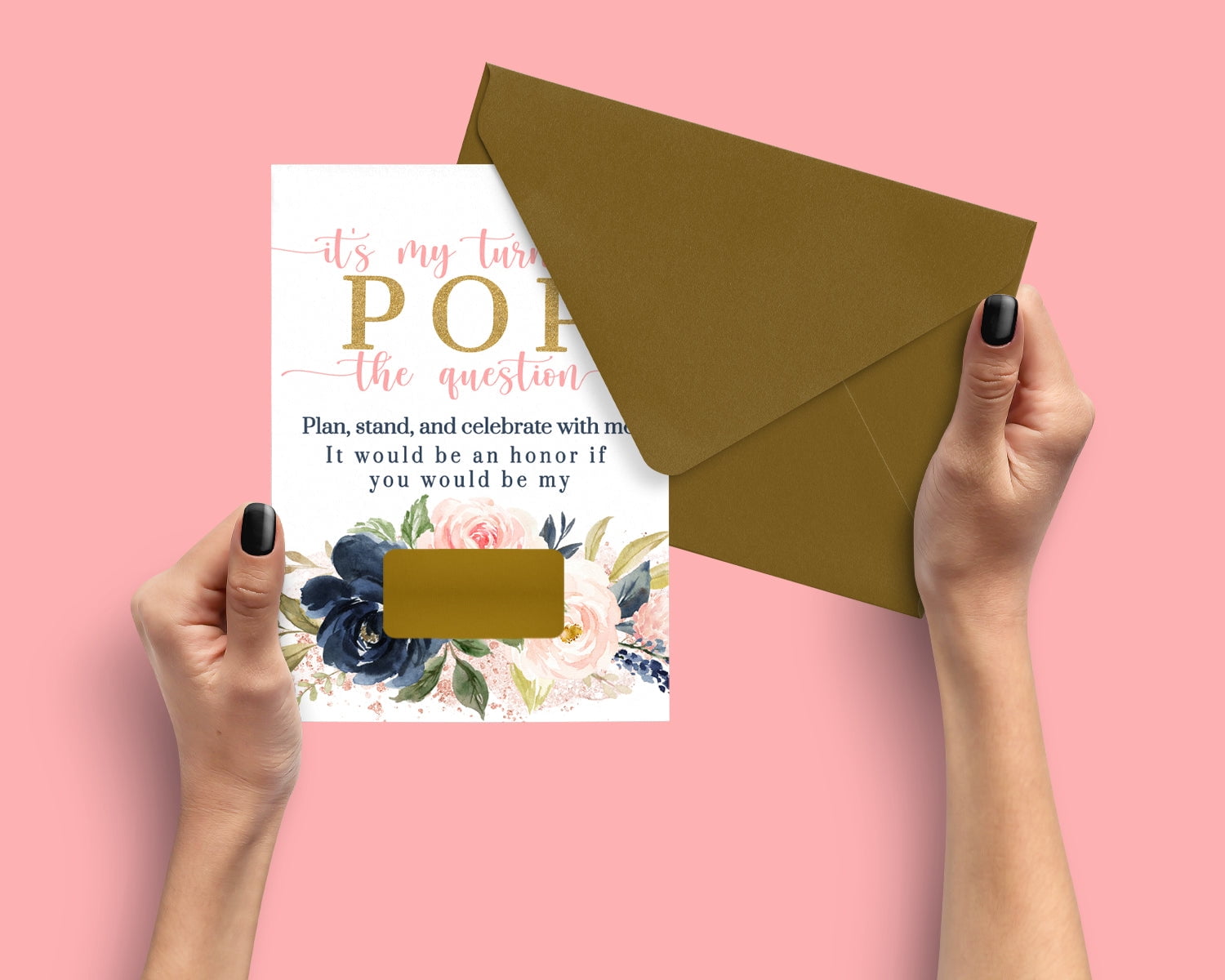 Pop the Question to my Bridesmaid Maid of Honor Matron of Honor Set of 12 Scratch Off Proposals with Envelopes Wedding Attendant Invite Set Pink Gold Blue Floral Event Theme Paper Clever Party