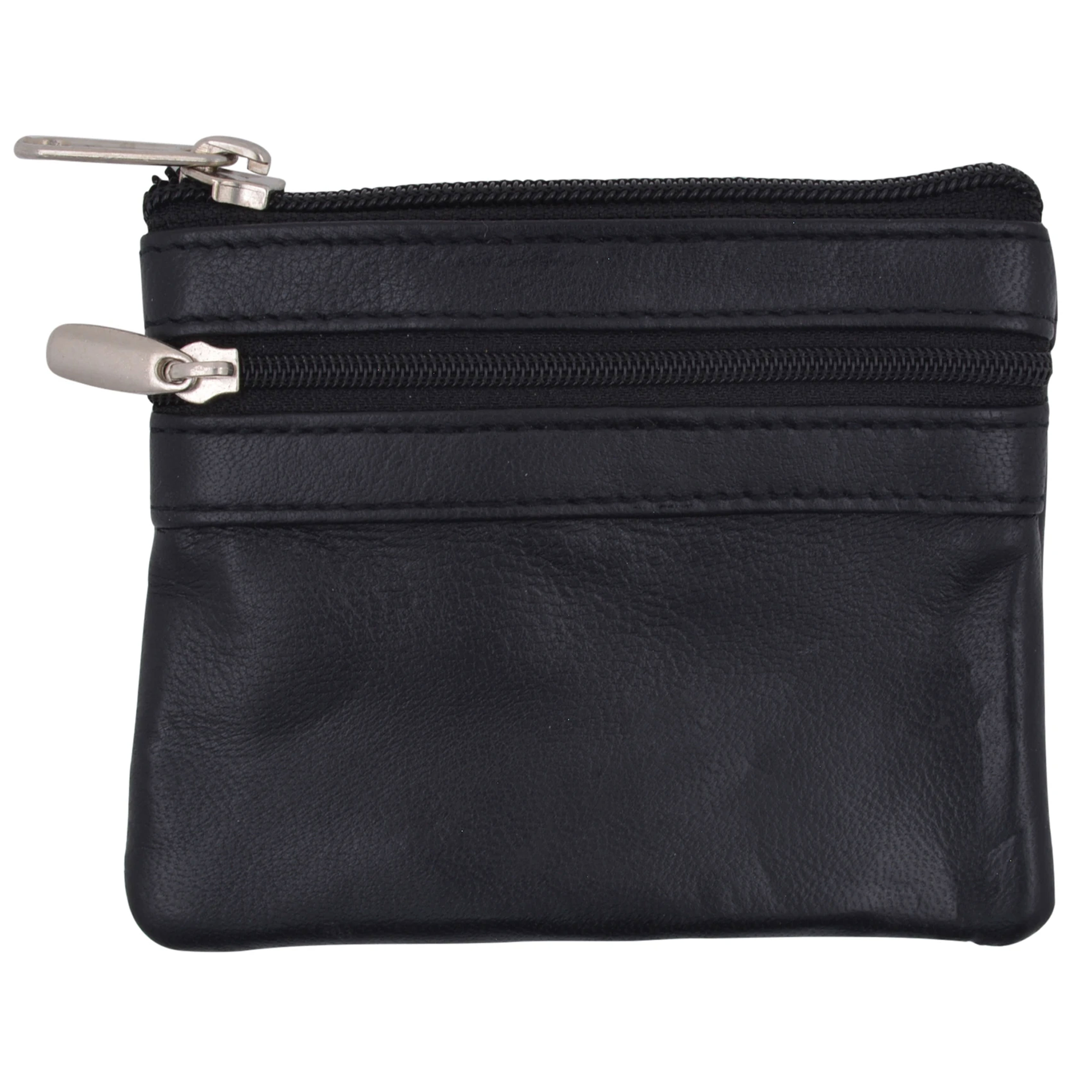 1 Coin Purse Change Pouch Genuine Leather Zippered Wallet ID Card Holder Genuine Leather Coin Change Purse 2 Zipper Compartments (1 Top, 1 Back) Front ID Window Key Ring Inside Main Compartment Dimensions: 3.7" H x 4.7" L Approx.