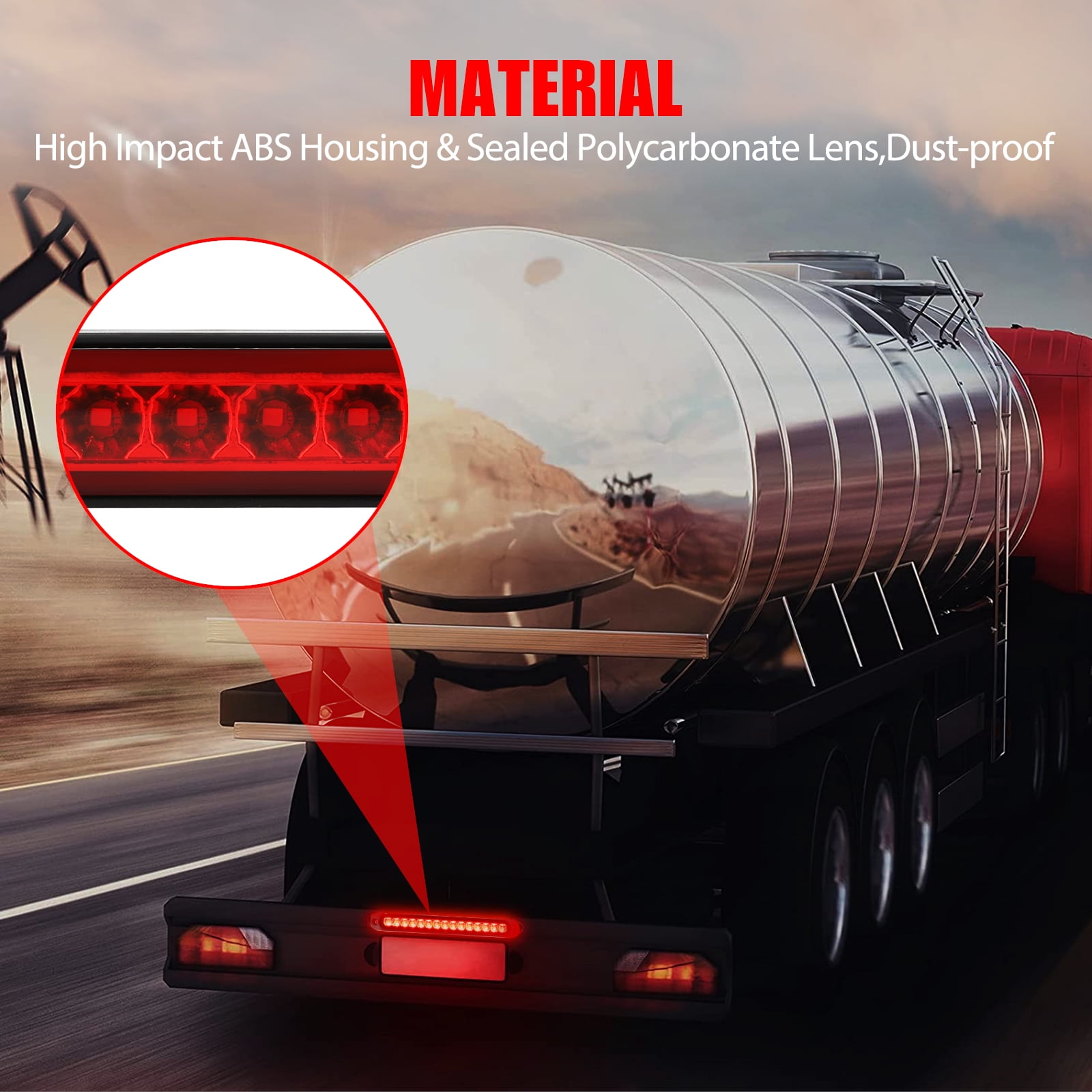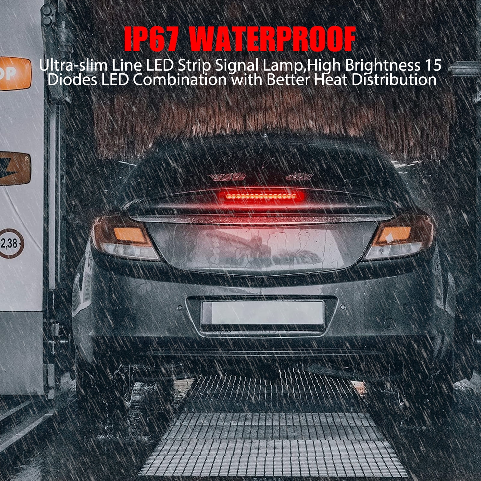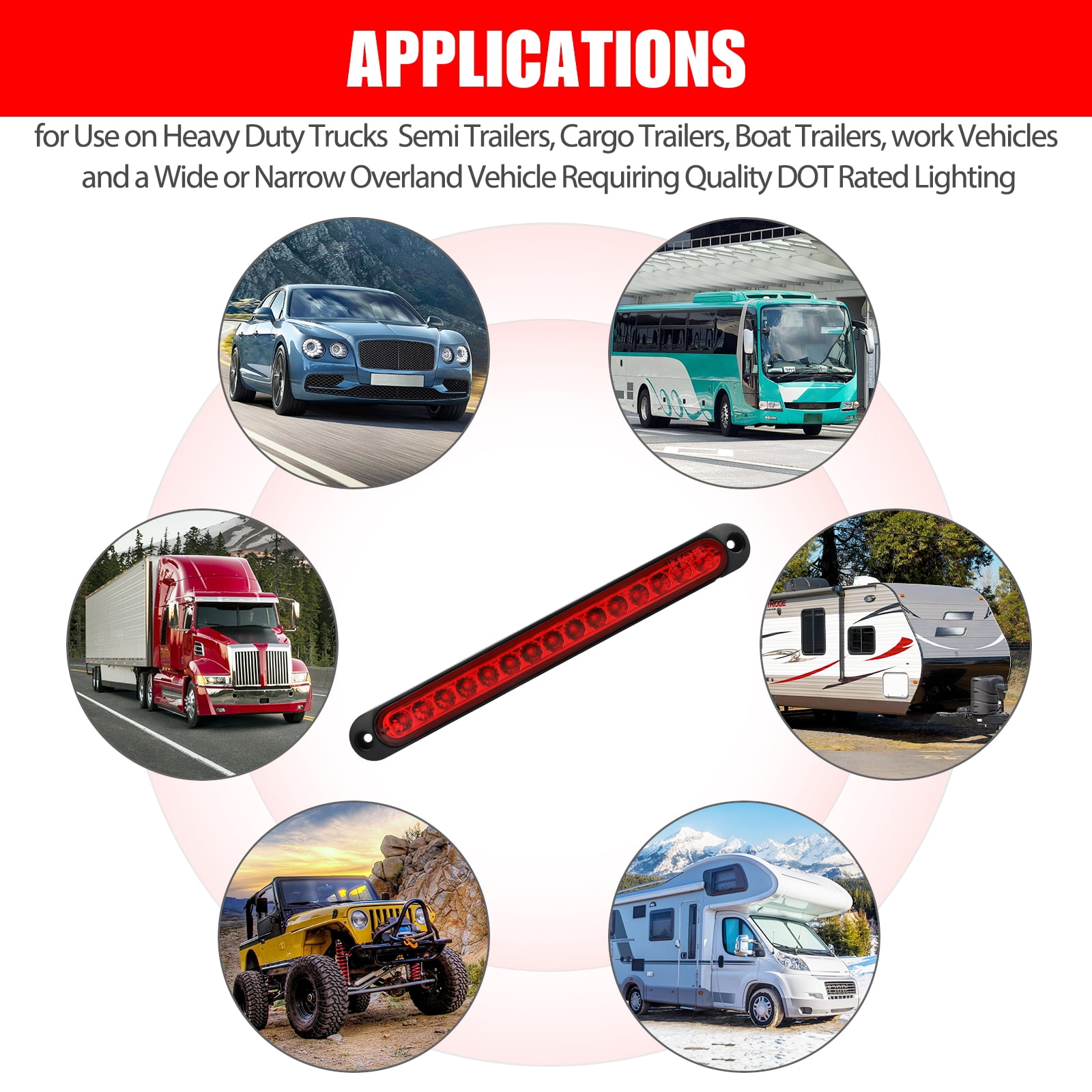 The 15 LED trailer light bars are made of high impact ABS housing and sealed polycarbonate lens. Sealed to IP67, these waterproof ultra-slim line LED strip signal lights to ensure reliable brightness in humid or rainy environments. The ultra-thin line LED light bar signal lamp has a high-brightness 15 diode LED combination and has a better heat distribution. The IP67 waterproof and dustproof design of the red trailer light bar can withstand all kinds of bad weather. The red LED tail light can use as a marker, clearance light, side marker, identification light, stop light, turn light, tail light, and brake light. Stop turn tail red lights are easy to install, white wire – ground; red wire high brightness; brown wire – low brightness. The red 15 LED trailer tail light bar is for use in heavy-duty trucks semi-trailers, cargo trailers, boat trailers, work vehicles, and a wide or narrow overland vehicles requiring quality dot-rated lighting.