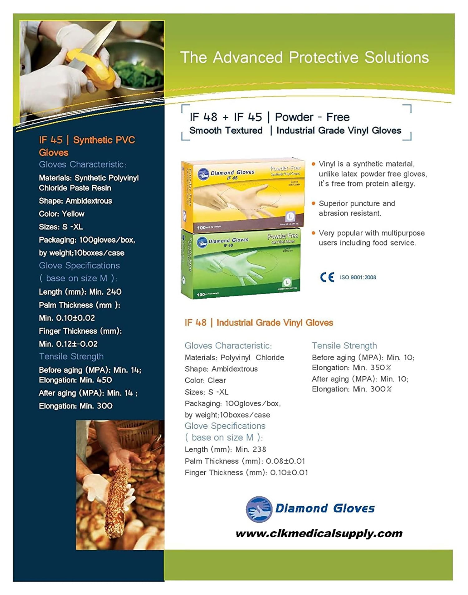 Diamond Gloves is based in Southern California. We are committed to provide safety and protection solution with our innovative disposable gloves as the necessity for most of the industrial and medical field nowadays. Because of our dedication in providing the best customer satisfaction, we are always in the initiation to maintain the quality consistency of our gloves. Vinyl is a synthetic material, unlike latex powder free gloves, it’s free from protein allergy. Superior puncture and abrasion resistant. Very popular with multipurpose users including food service. Ambidextrous. Clear in color. For Unisex
