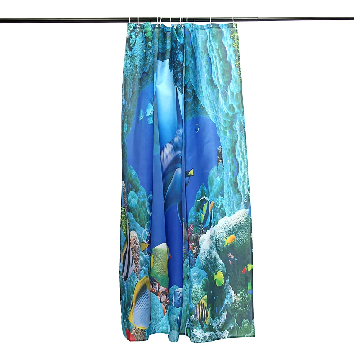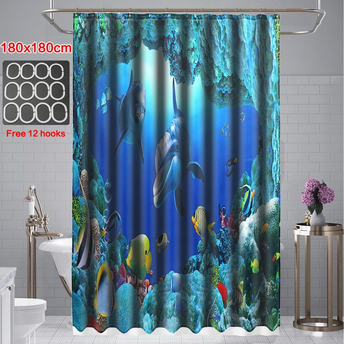 3Pcs Bathroom Set Pedestal Floor Rug + Lid Toilet Cover +Non-Slip Bath Mat Doormat /71”x 71” Shower Curtain +12 Hooks Rings Dolphin Ocean Waterproof Polyester Home Decor