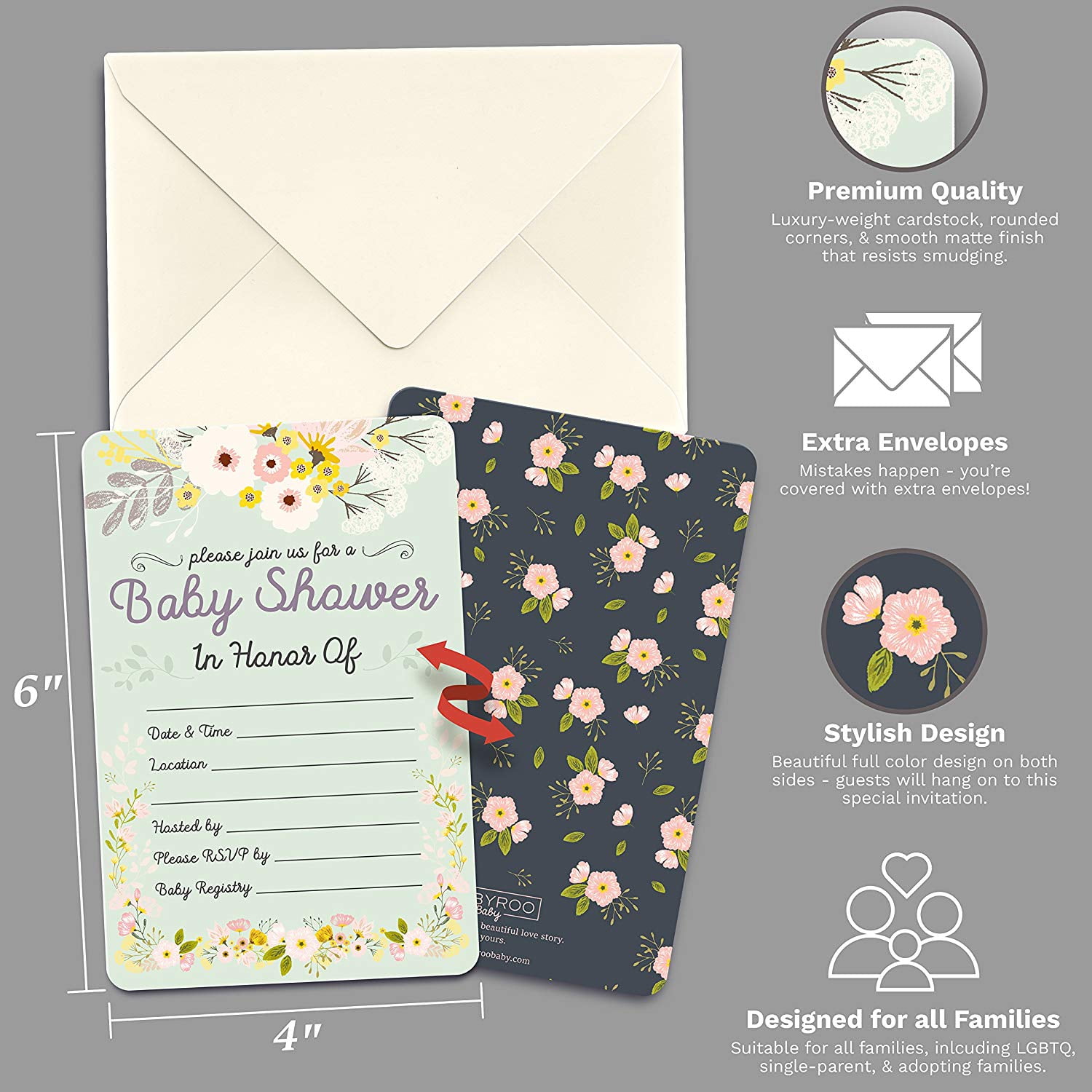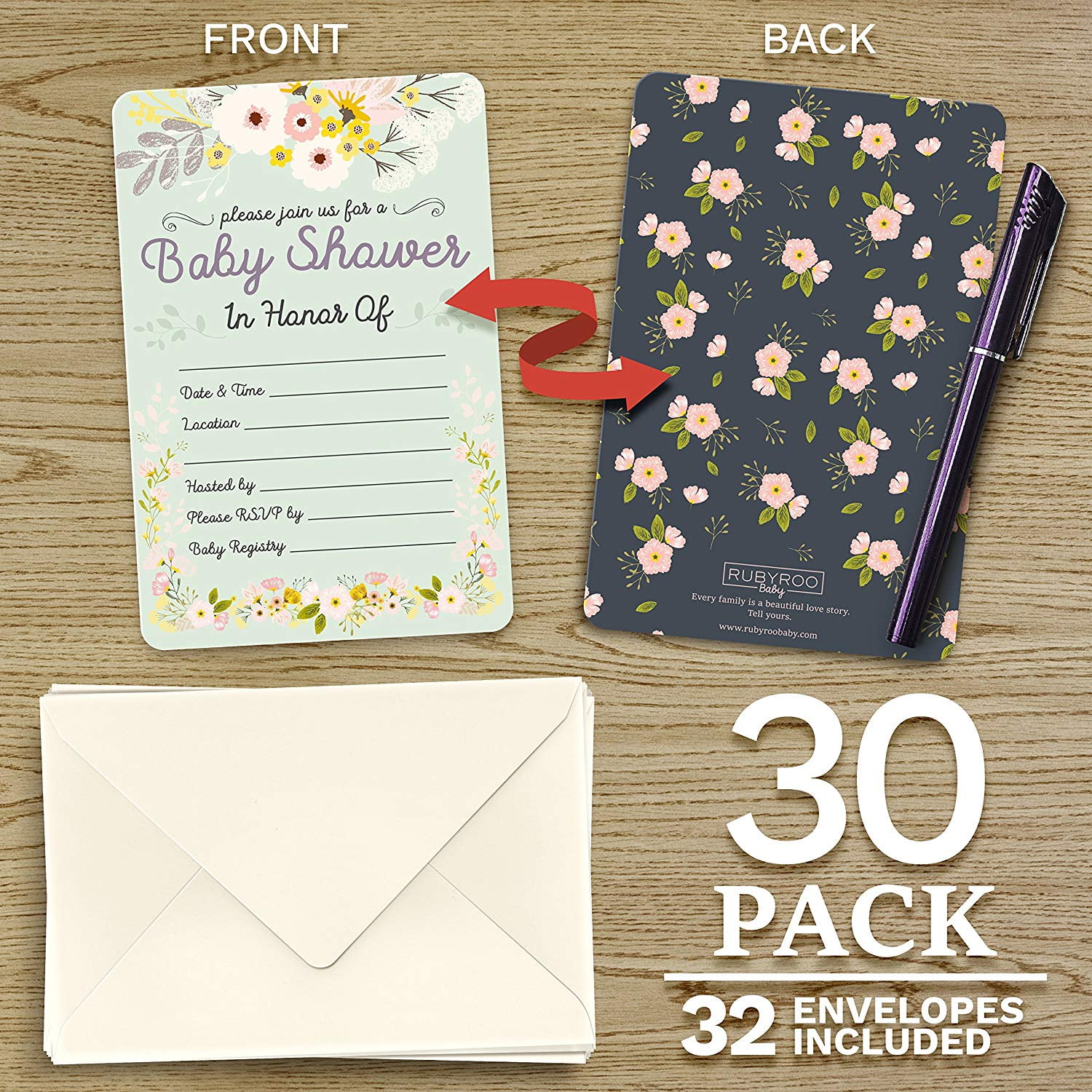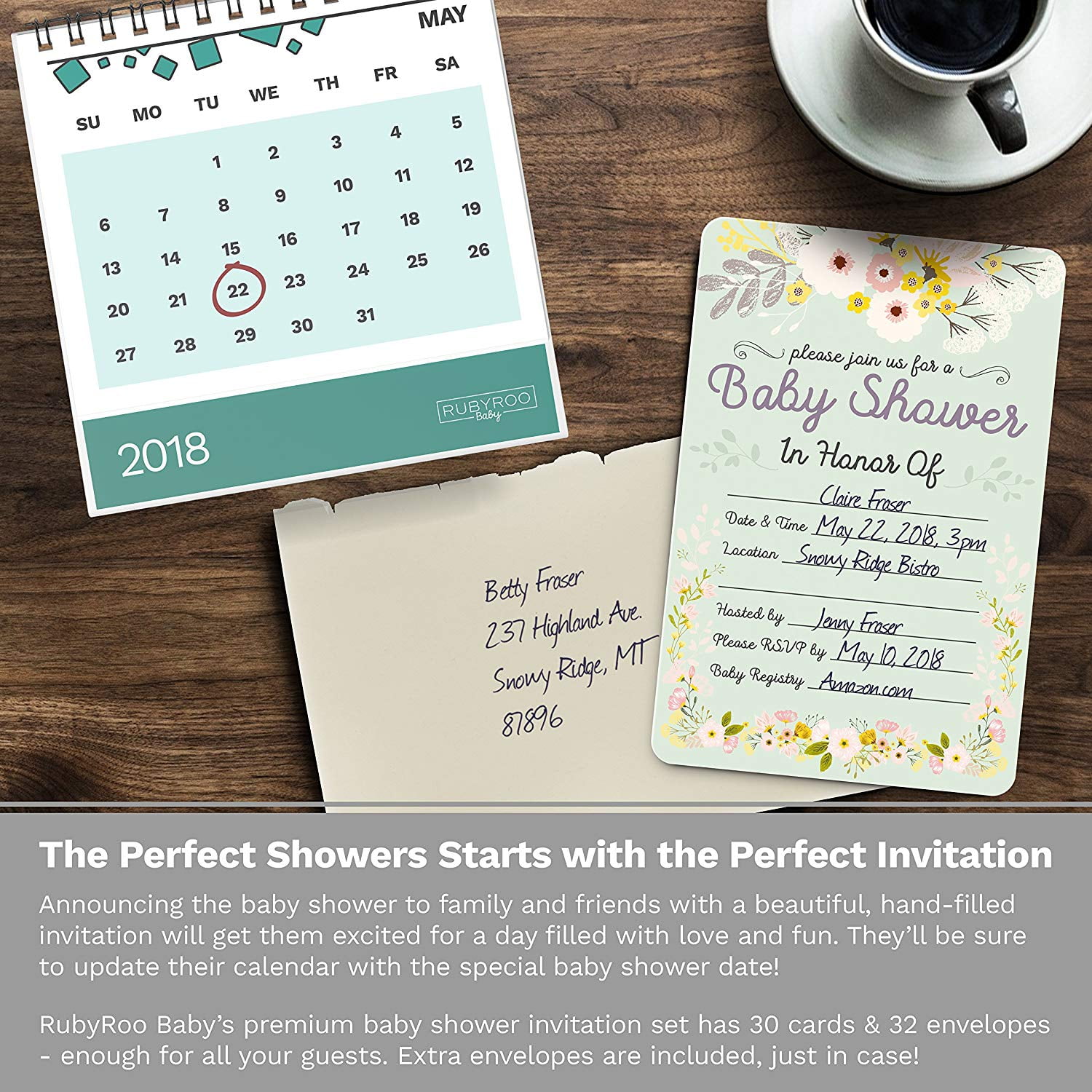 - THE PERFECT BEGINNING: Your lovely, premium baby shower invitation set comes with 30 cards & 32 envelopes. Guests will quickly RSVP for your special baby shower celebration!