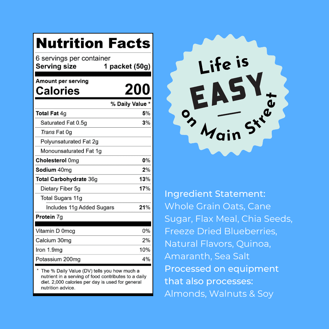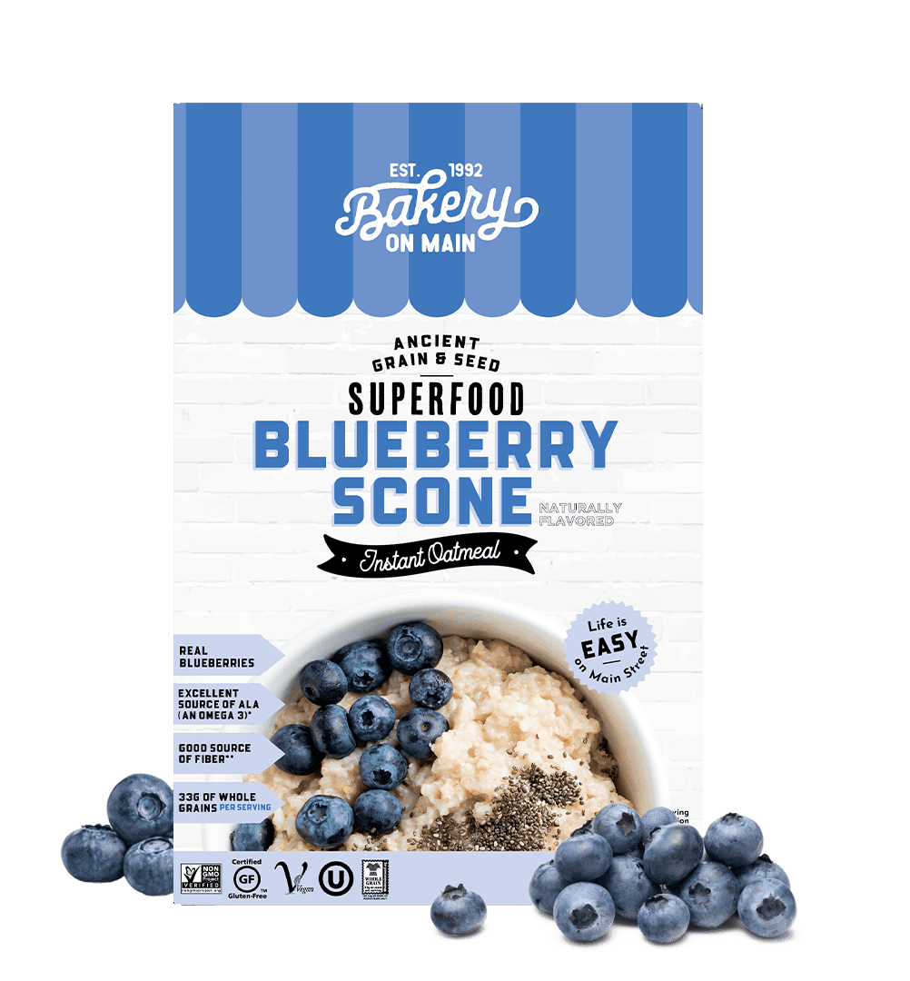 Combining a unique blend of certified gluten-free oats, ancient grains, and the mouthwatering flavor of sweet blueberries, you won’t be able to resist the deliciousness of our blueberry scone instant oatmeal! About the Brand Founded in 1992, our story began as a bakery inside a small natural foods market on Main Street in Glastonbury Connecticut. Here we discovered our passion for creating delicious gluten-free and celiac-friendly breakfast and snack foods. We pride ourselves on our ability to craft granola, snack bars, and oatmeal that taste just as good (if not better) than our less healthy competitors. It’s our belief that everyone should be able to enjoy a satisfying meal that doesn’t sacrifice taste for wholesomeness. To indulge in a snack that’s filling and nutritious, a snack that fits perfectly within any individualized dietary wants and needs. Bakery On Main promises simple, effortless eating and snacking, on anybody’s terms.