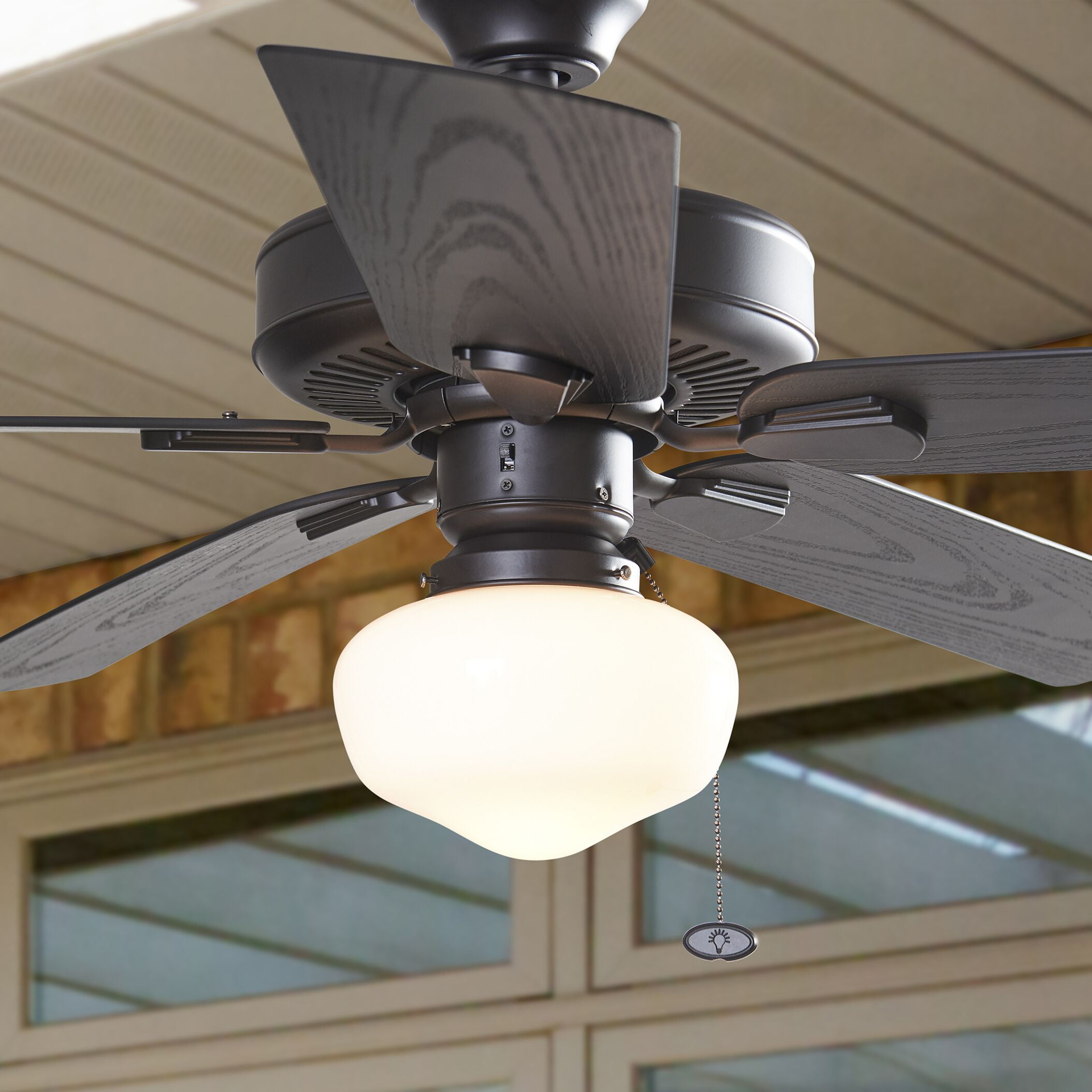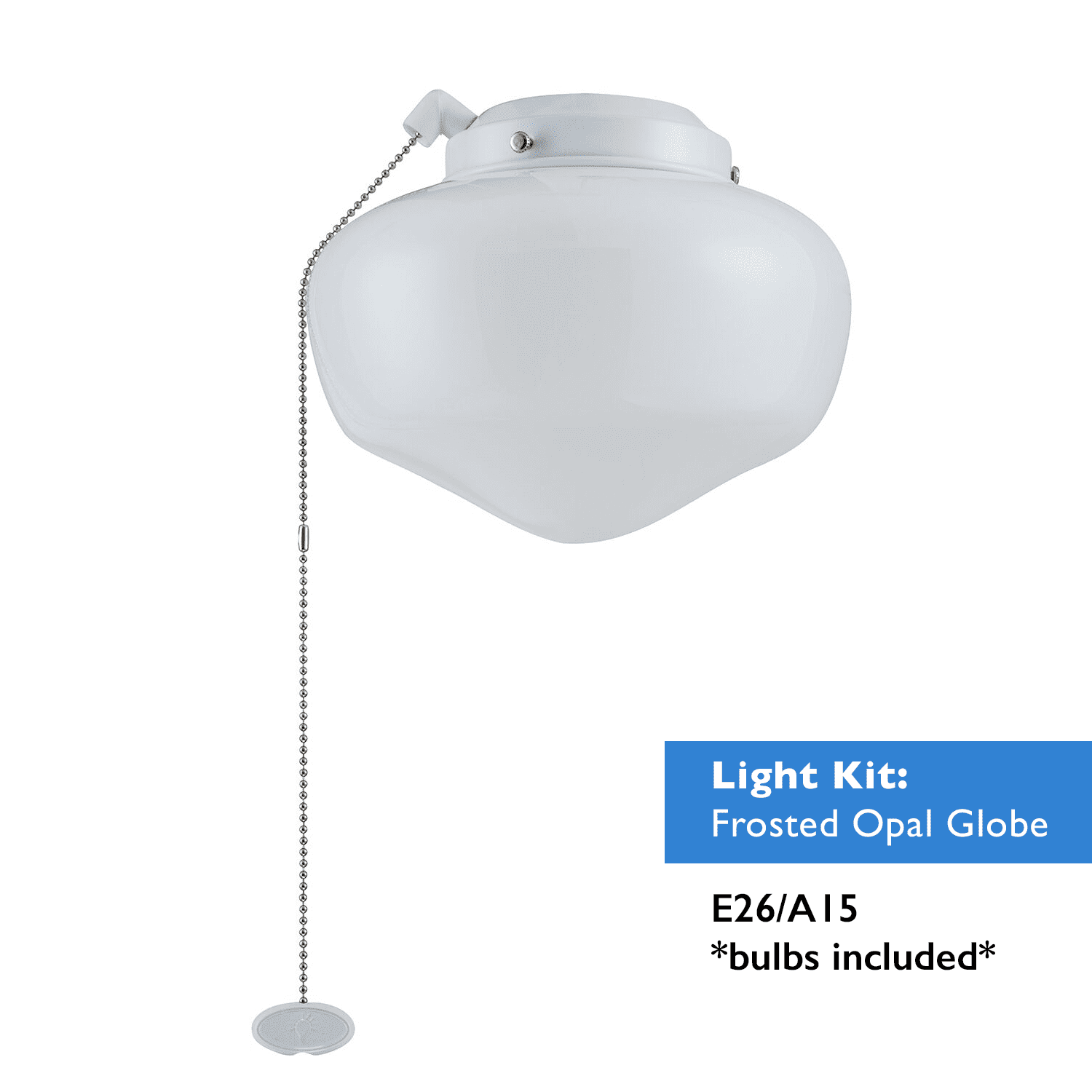 Pair this classic style Better Homes & Gardens White Glass Outdoor Ceiling Fan Light Kit with The Better Homes & Gardens 52" Outdoor 5 Blade Ceiling Fan and you’re sure to brighten and enhance your outdoor porch, patio, gazebo, breezeway, garage, balcony or veranda – really, any covered or uncovered outdoor space you have is perfect as it’s wet-rated, sure to withstand the elements, and it is also backed by a limited lifetime warranty! It is a breeze to install and includes one on/off light pull chain, one E26, A15 light bulb and two globe fitters, one in White and the other in Oil-Rubbed Bronze, so you’re sure to find the perfect match to your Better Homes & Gardens Outdoor Ceiling Fan.Outdoor, Wet Rated; Timeless Frosted Opal Glass Schoolhouse Globe; Interchangeable Globe Fitters in White and Oil-Rubbed Bronze Finishes; Easy Installation; On/Off Pull-Chain Adjustable Light Settings; High Quality and Limited Lifetime Warranty