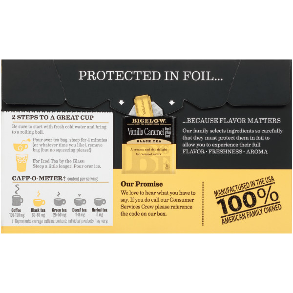 Indulge yourself with this delicious tea which is a classic combination of smooth bold black tea blended with rich caramel and creamy vanilla. What makes Bigelow Vanilla Caramel tea taste so special? Our ingredients are carefully selected by the Bigelow family to deliver you an uncompromised quality tea experience. Our recipe combines hand-picked tea leaves, harvested at their peak using only the top two tea leaves and the bud. A touch of milk and a little sweetener will bring out the superb flavor sensation. Each box of this caffeinated black tea contains 20 tea bags. To maintain the integrity of our exceptional ingredients, we wrap each tea bag in a foil pouch to ensure the fullest flavor, freshness, and aroma. It also makes it convenient to take Bigelow Tea everywhere you go. Bigelow Tea is proud to be 100% family owned and operated for over 75 years. We are honored to be a Certified B Corporation. This achievement recognizes our commitment to the highest standards of social and environmental impact. Because it’s all about doing the right thing.