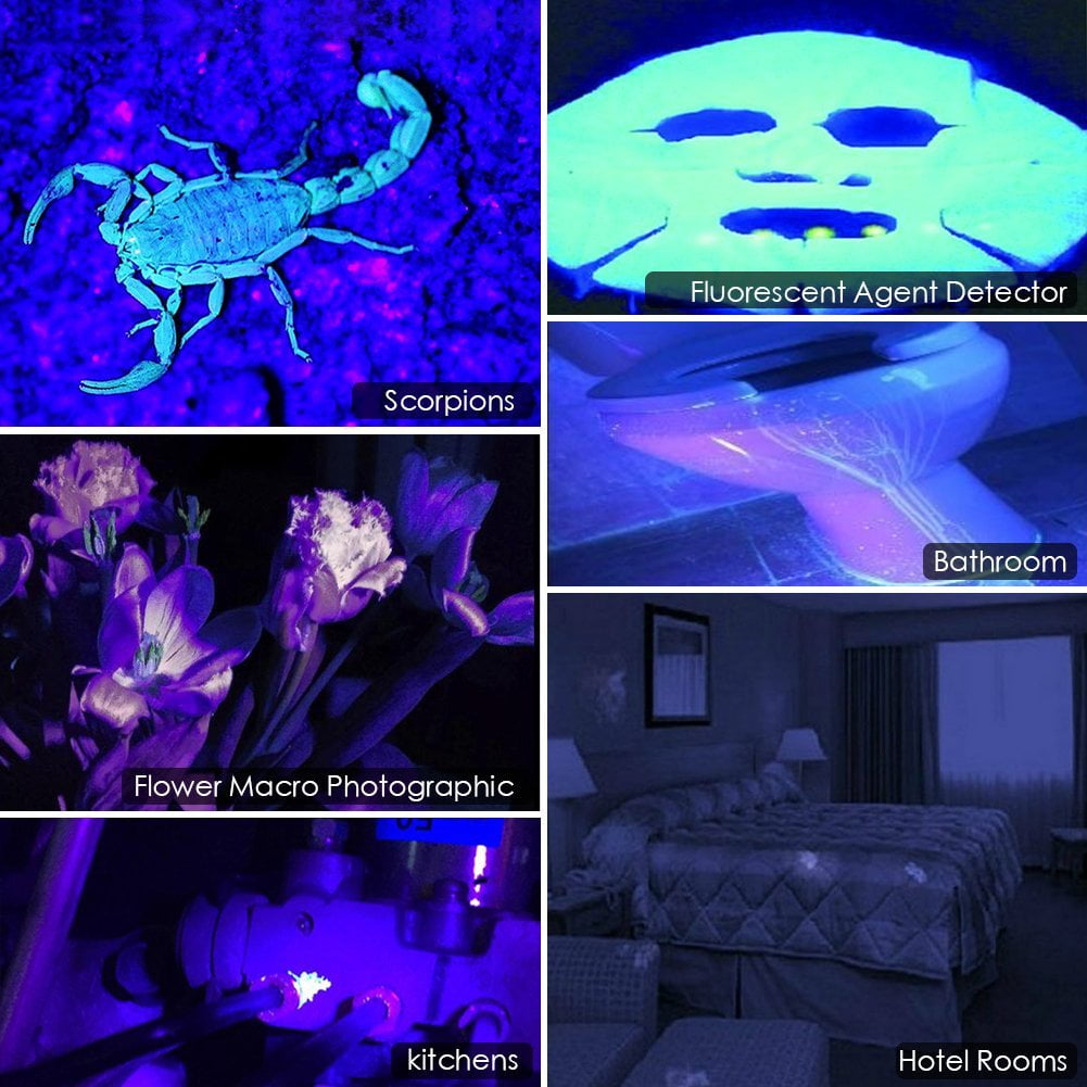 - 128 UV LEDs with professional grade ultra-intensity 18W power and 395 nm wavelength, could work as a portable pet (dog/cat) urine detector light, scorpion finder, golf finder, fluorescent detector, currency/license/card/passport authenticating It can also detect oil stains/leakage, blood, body fluids, fluorescent substances on baby clothes, and etc.