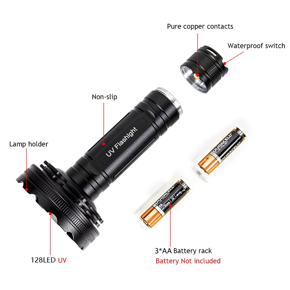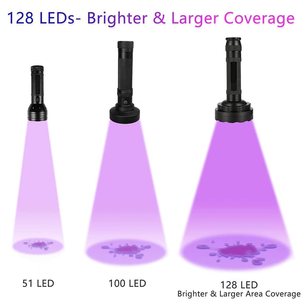 - Ultraviolet flashlight with 128 LEDs target at wider illumination area and a wider range of usage. Professional blacklight flashlight is made of aircraft-grade aluminum and ultra-intensity 128 LEDs with anti-abrasive surface, non-slip textured grip, which improves experience at most.