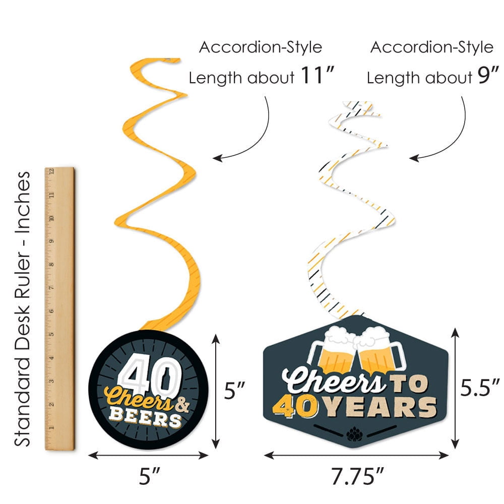- HIGH-QUALITY PARTY SUPPLY: Cheers and Beers to 40 Years Party Decoration Swirls are professionally printed and double-sided on heavy-duty cardstock paper. They are individually cut, inspected, and carefully packaged. Each swirl will use one clear hook.