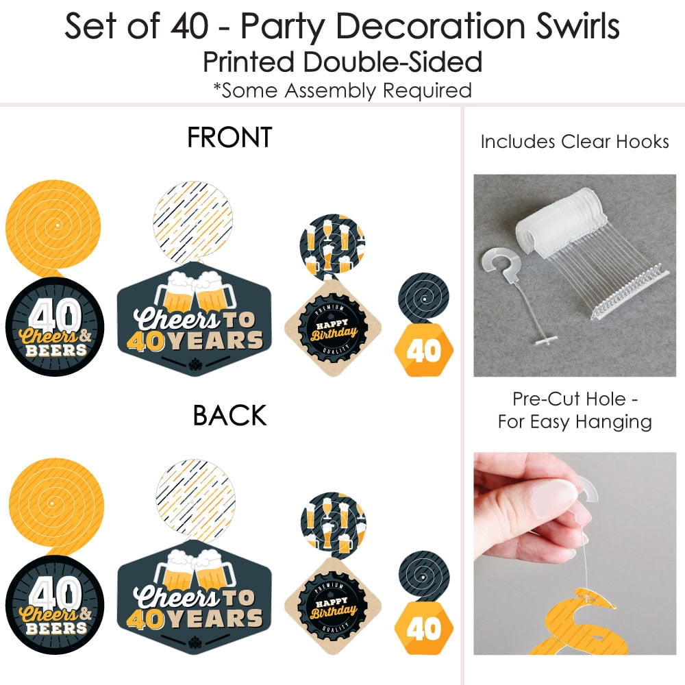 - Take your 40th birthday party to the next level when you add Cheers and Beers to 40 Years Party Decoration Swirls. This set of 40 is professionally printed and double-sided on heavy-duty cardstock paper and all swirls hang below an accordion-style spiral with included clear hooks. Show your creative side when you decide to hang Party Decoration Swirls high or low throughout your party space. Party Decoration Swirls are your go-to party decorations to help you become a party-throwing hero.